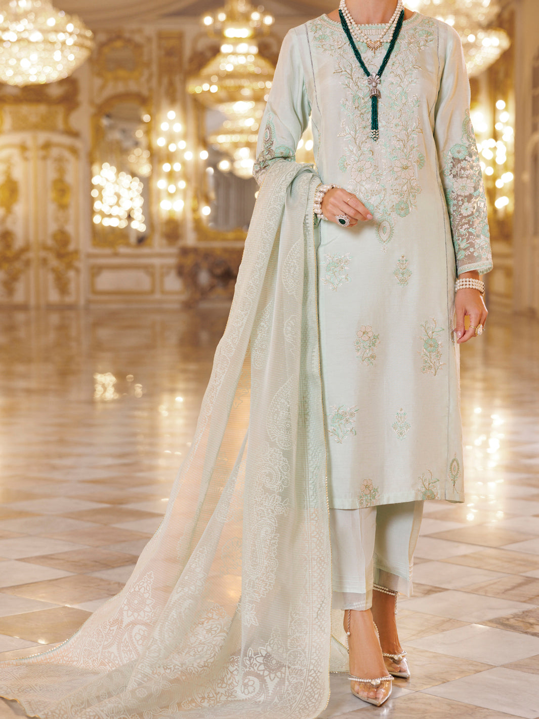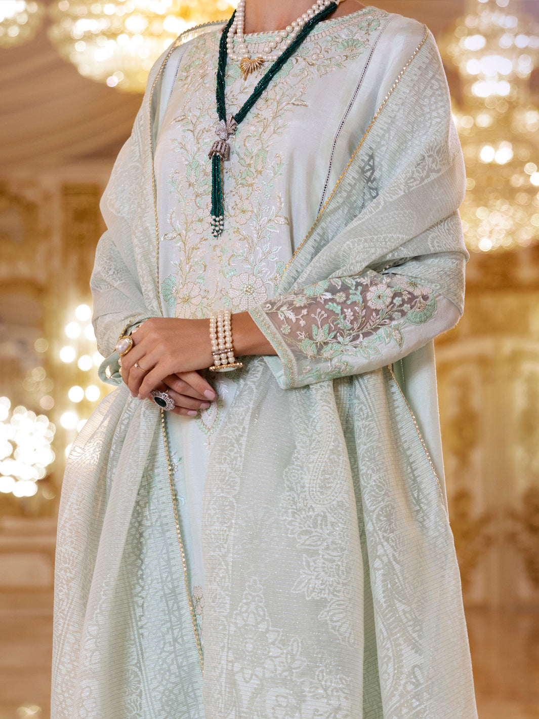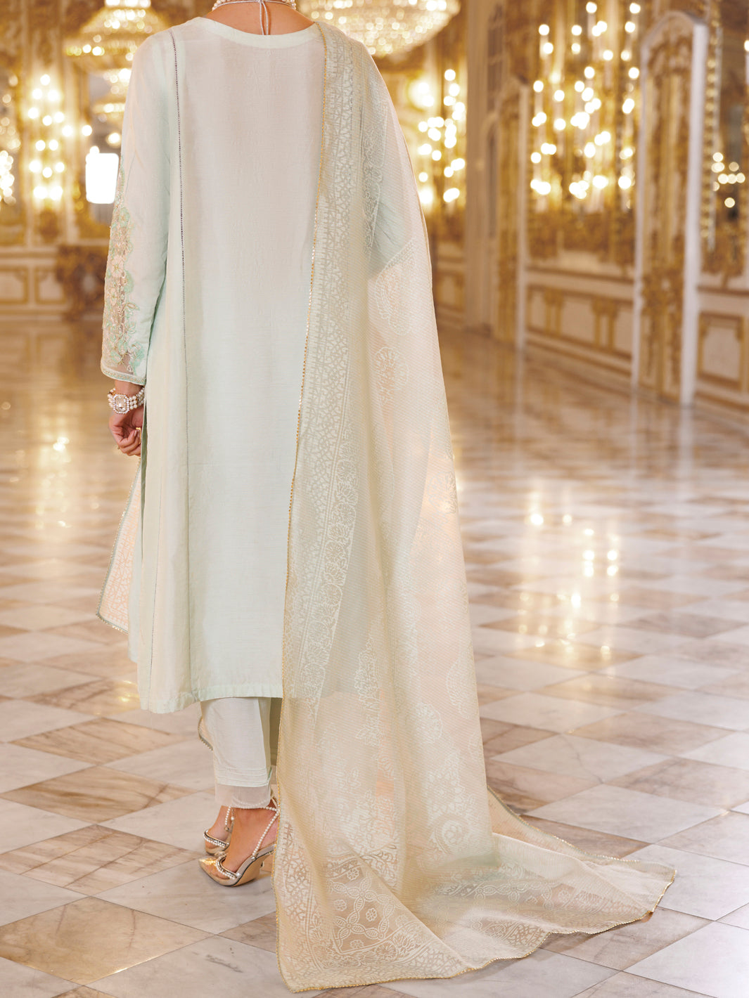 Sheesha Silk Shirt With Embroidered Front And Sleeves Paired With Sheesha Silk Fitted Trousers And Burnout Dupatta.