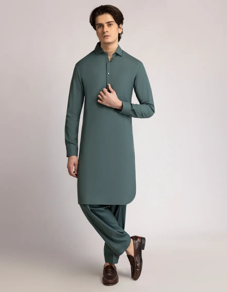 This Green Casual Kameez Shalwar stands out with its fine stitching and a unique touch of design. Subtle patterns and smart button detailing add to its appeal.