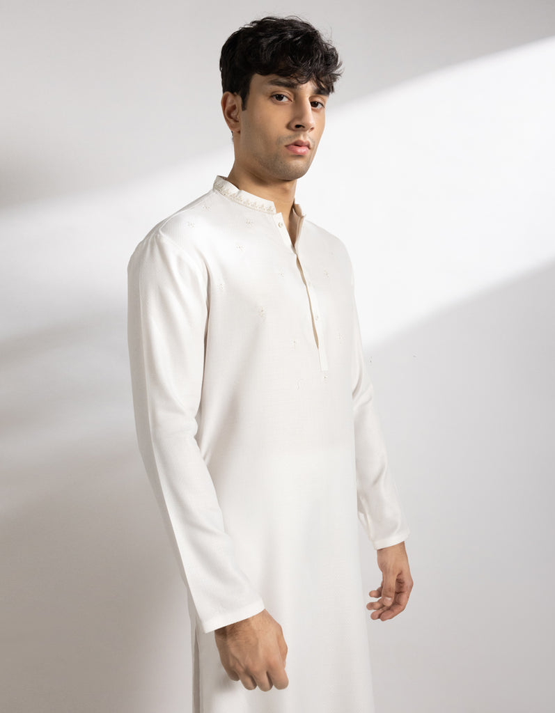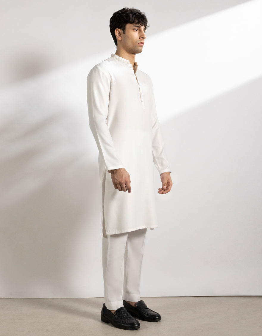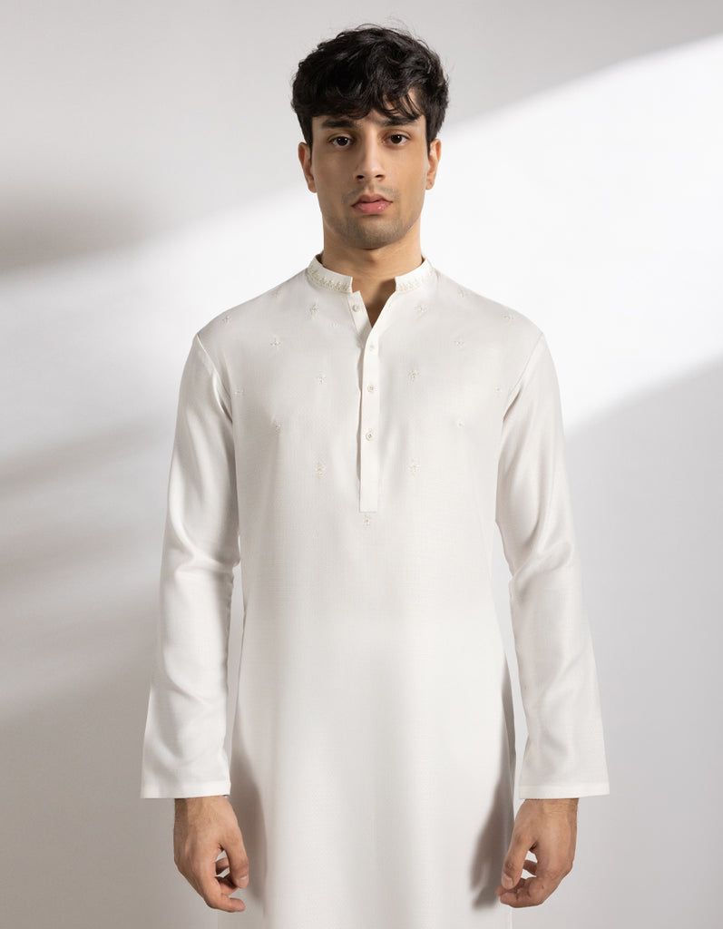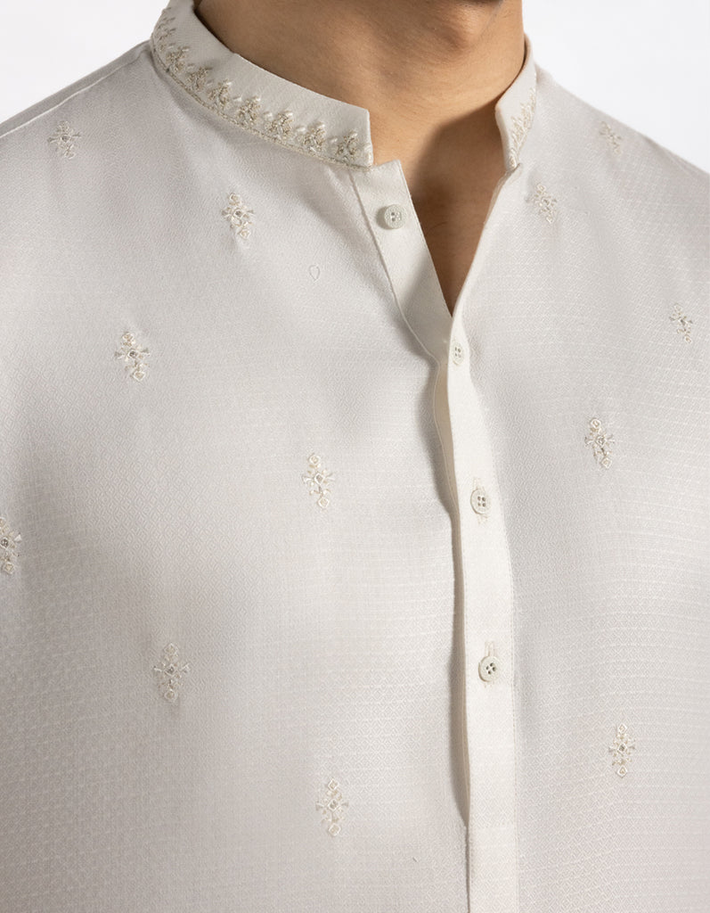 A well-crafted Off White Blended Kurtafeaturing detailed stitching and tasteful patterns. Contrasting or matching buttons give it a stylish edge without losing its elegant charm. A smart choice for teens who prefer a decent yet trendy outfit.