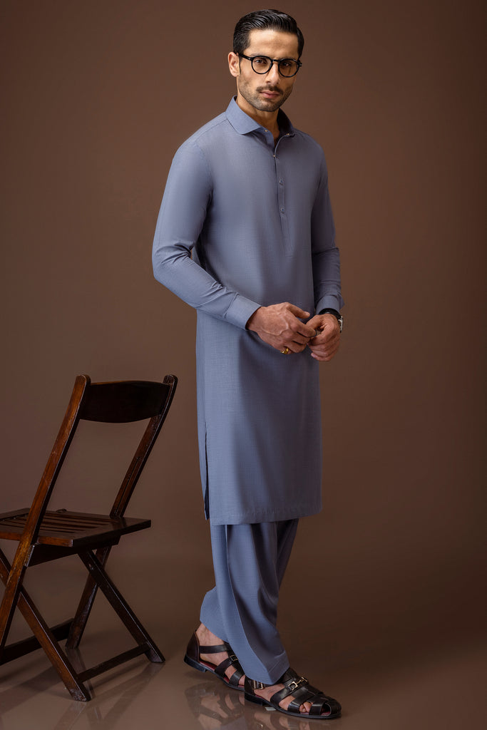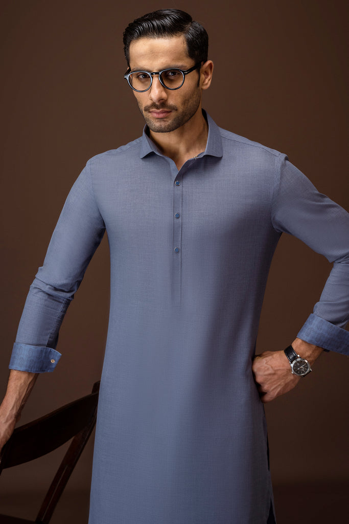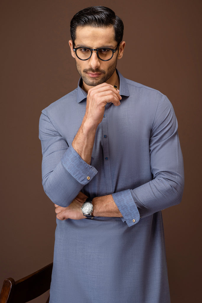 Round edge shirt collar with cuffs. Embroidery at front, front placket, yoke, cuffs & sleeve vents, Square hem.