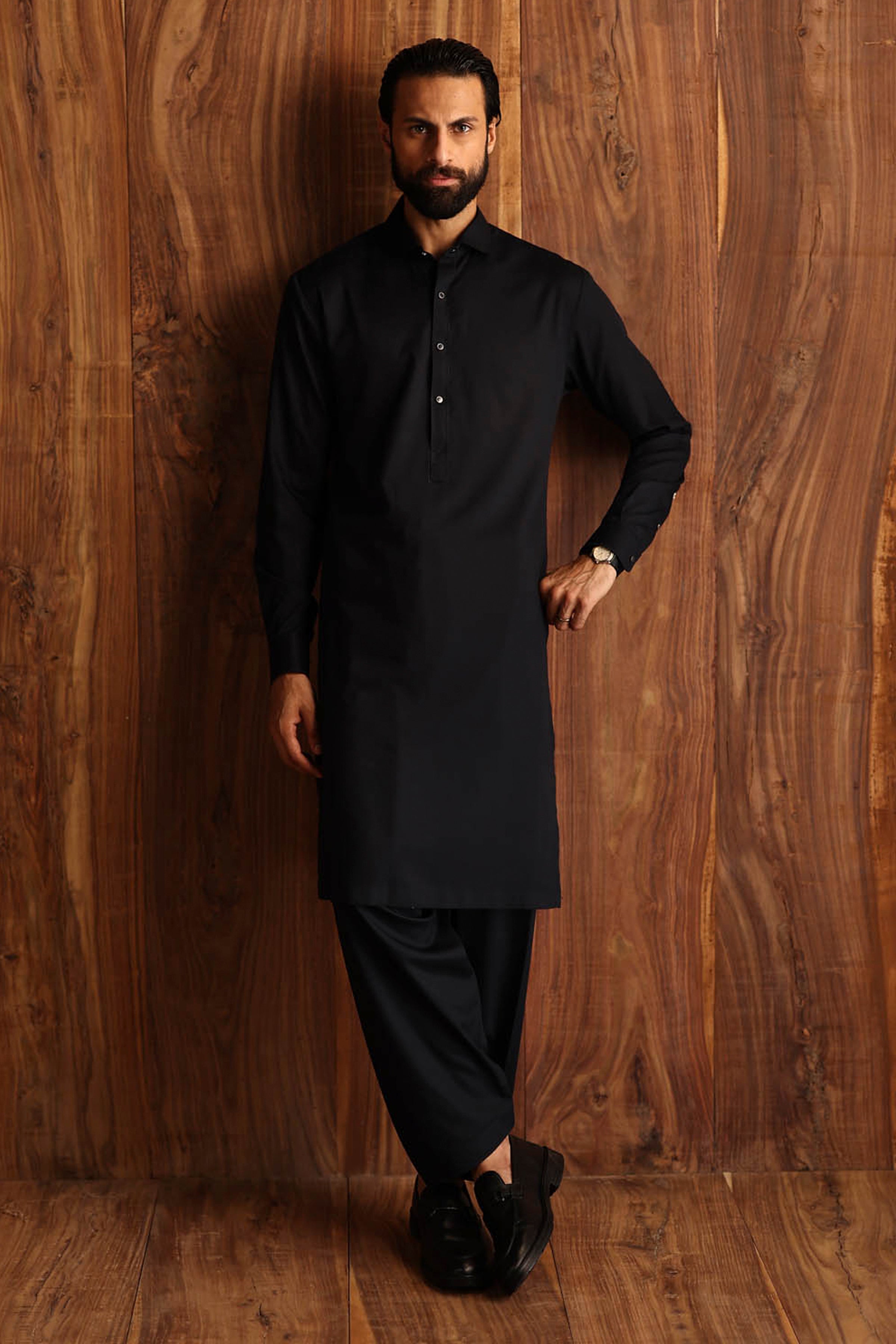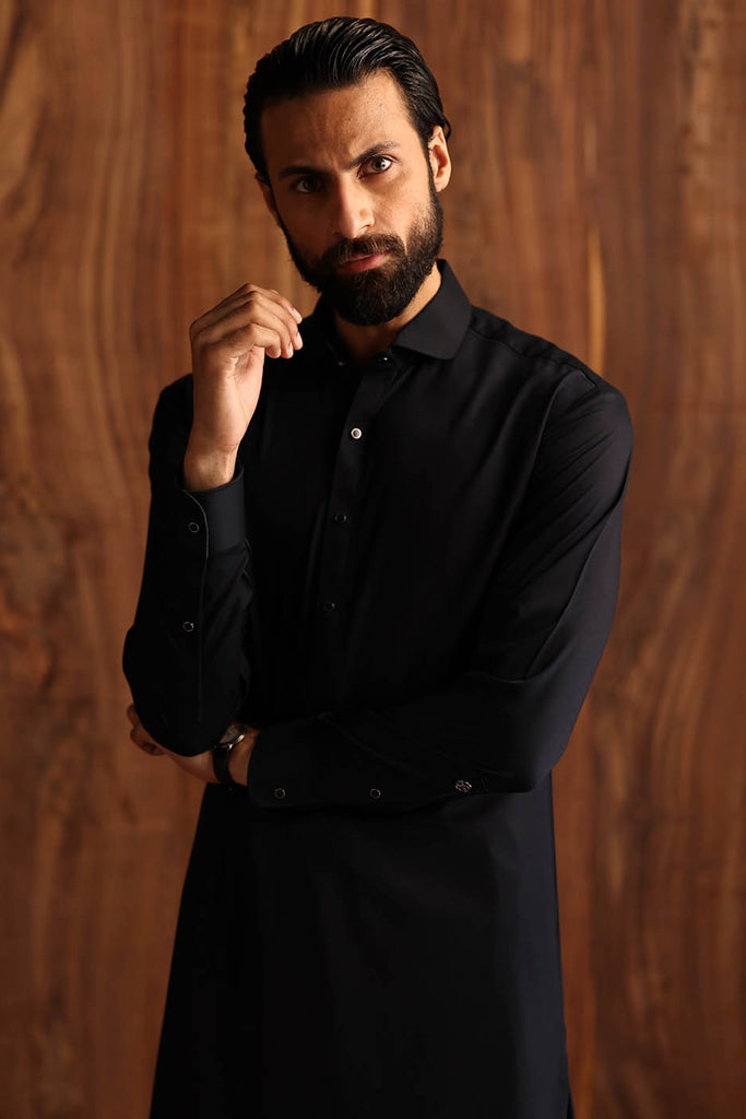 Round Edge Shirt Collar With Cuffs. Embroidery at Front, Yoke, Cuffs & Sleeve Vent. Square Hem