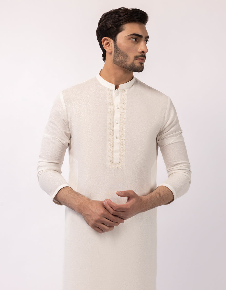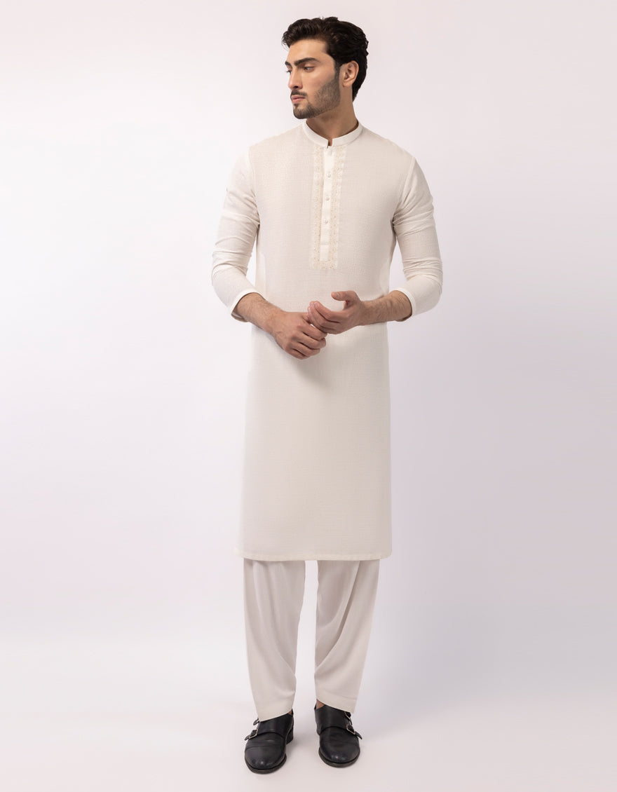 A timeless off white men formal kameez shalwar designed with neat stitching and a comfortable fit. Ideal for formal events and cultural gatherings.