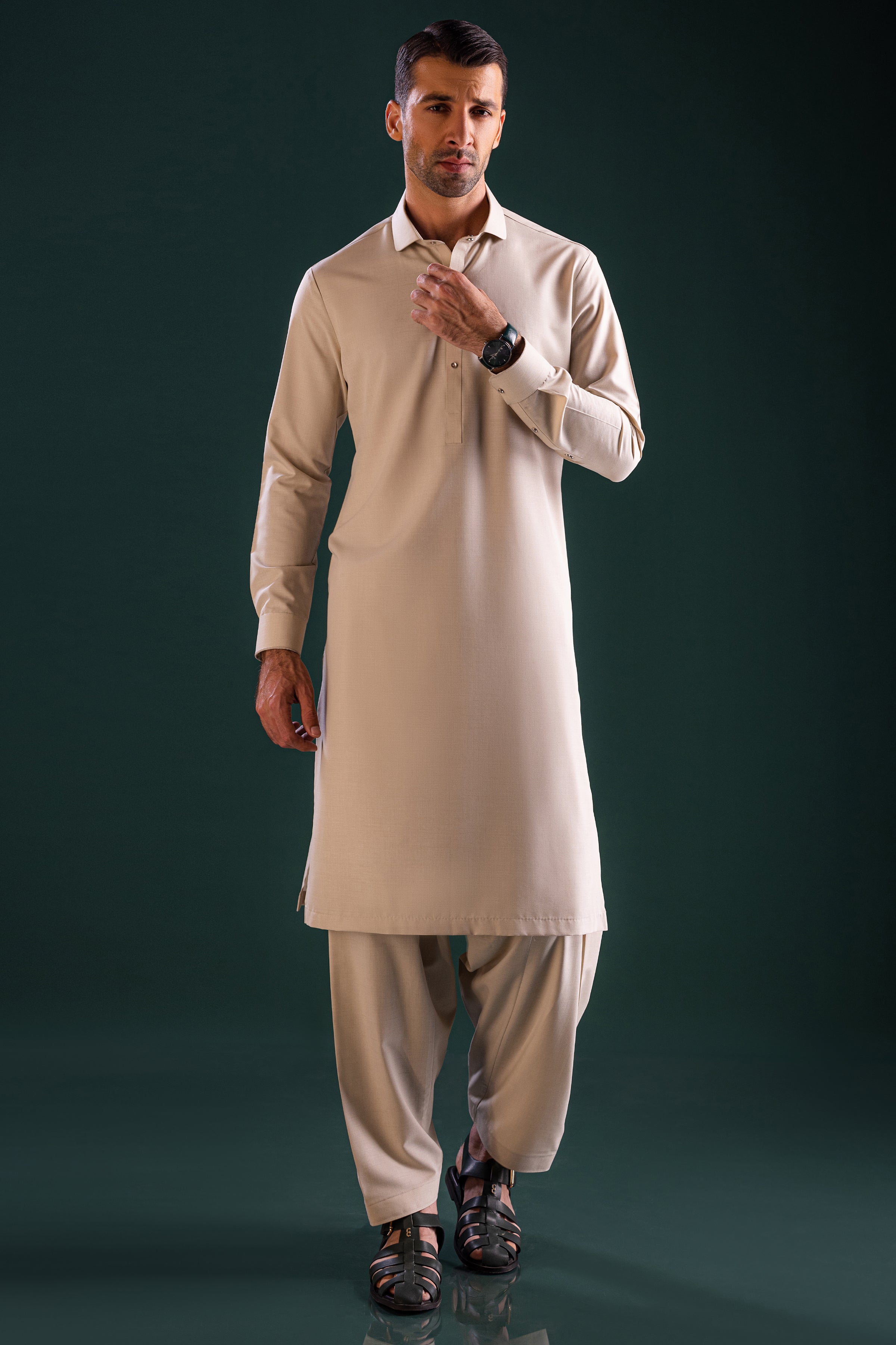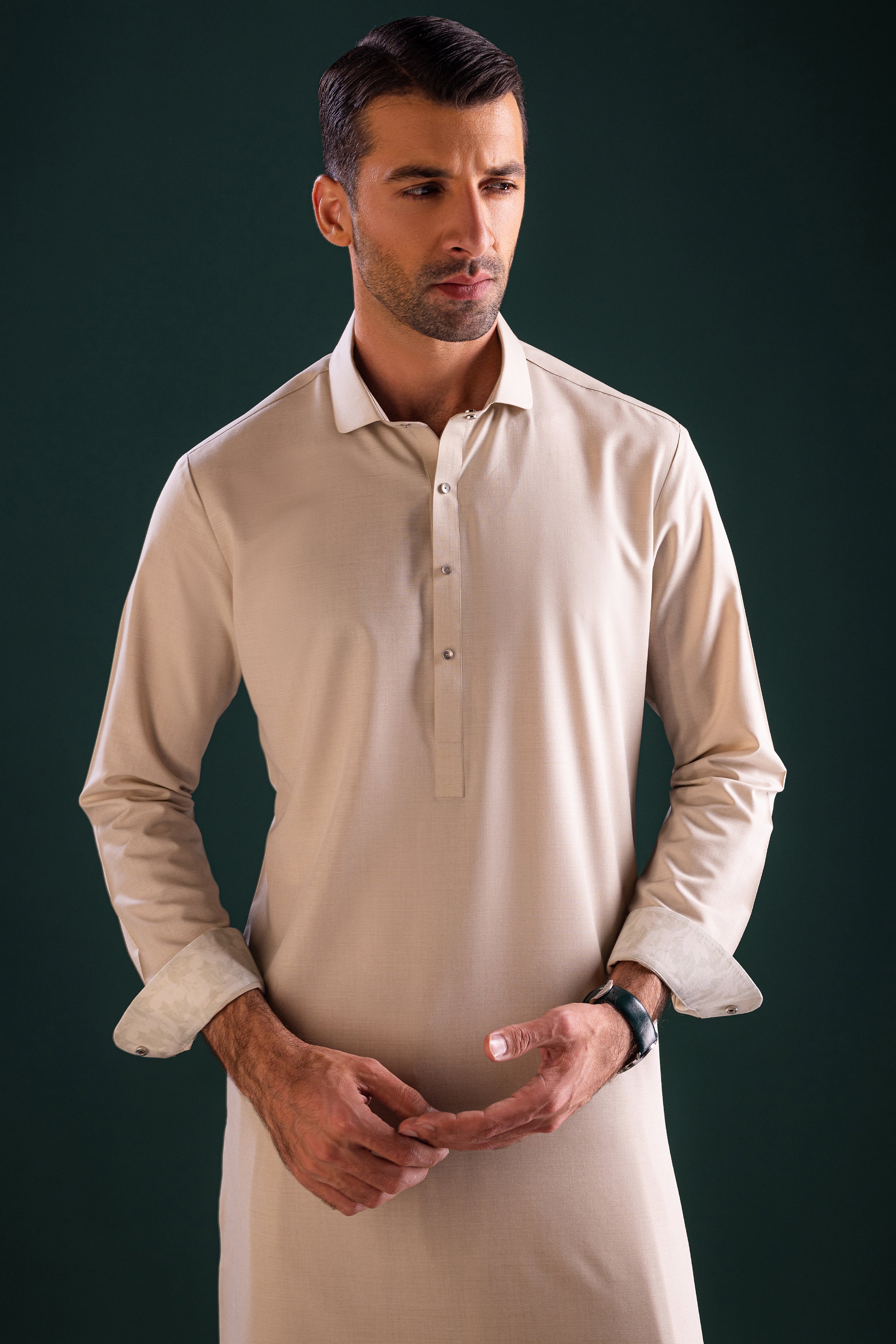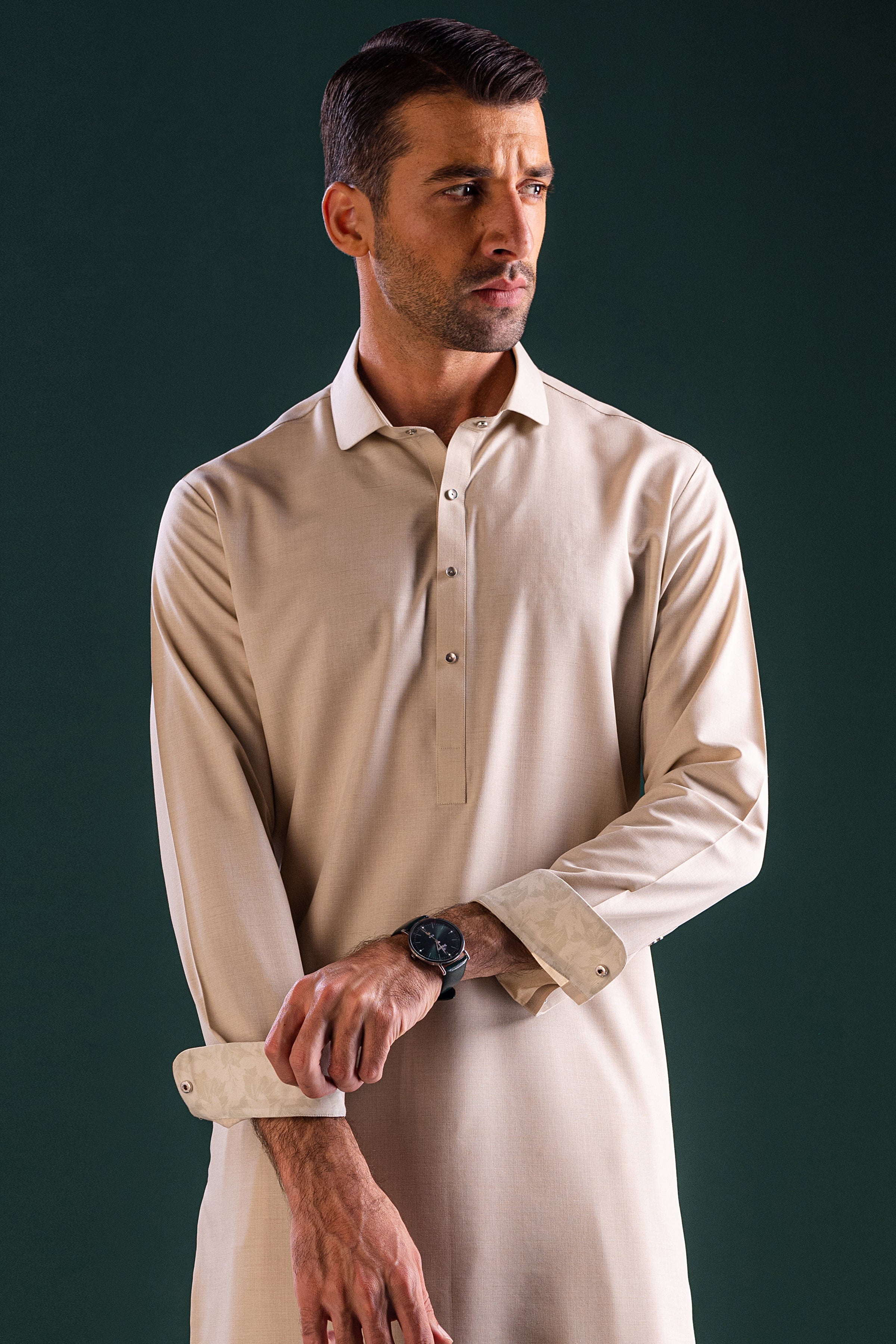 Shirt Collar With Cuff. Embroidery on Front, Button Placket, Cuffs, Sleeve Vent & Yoke.