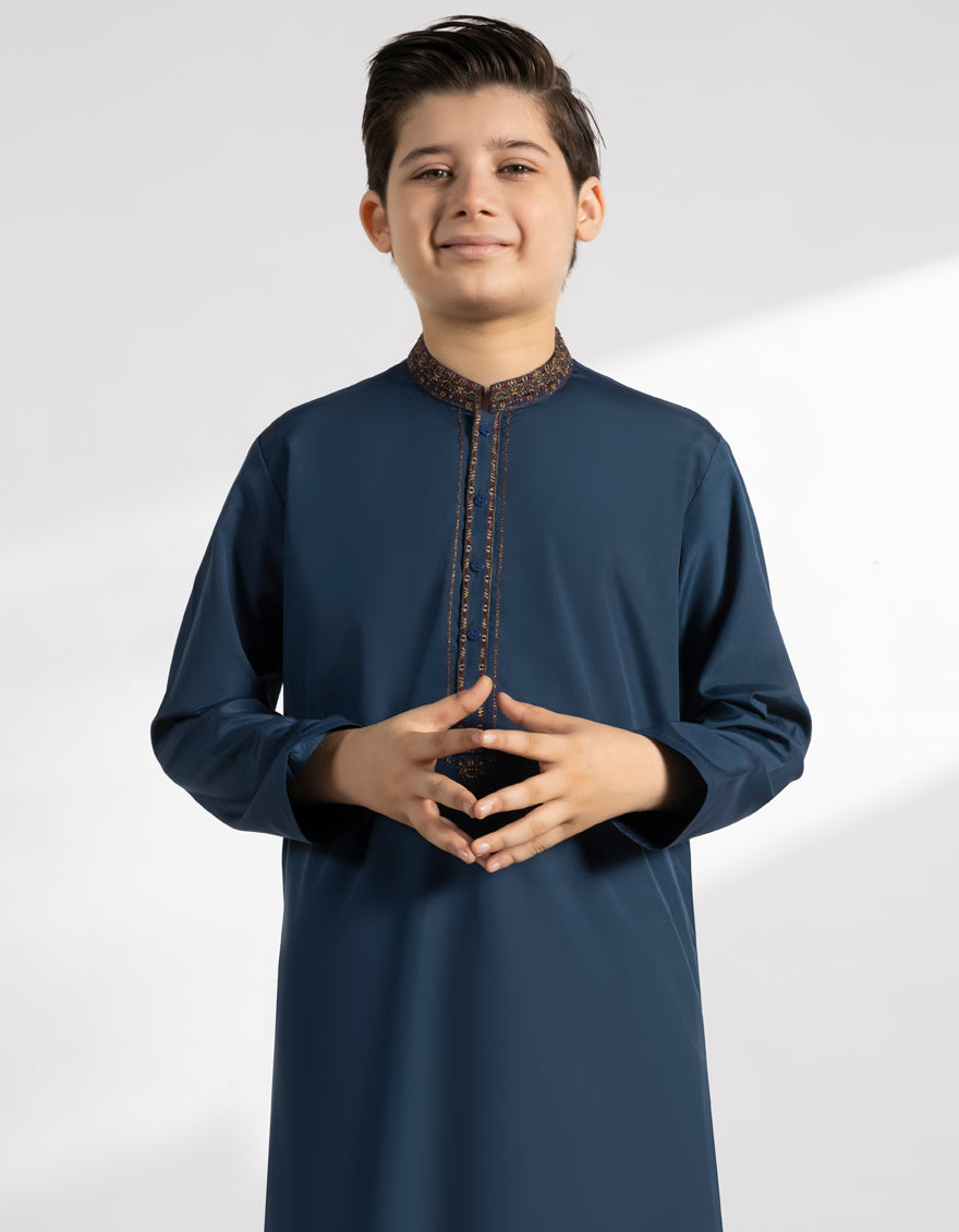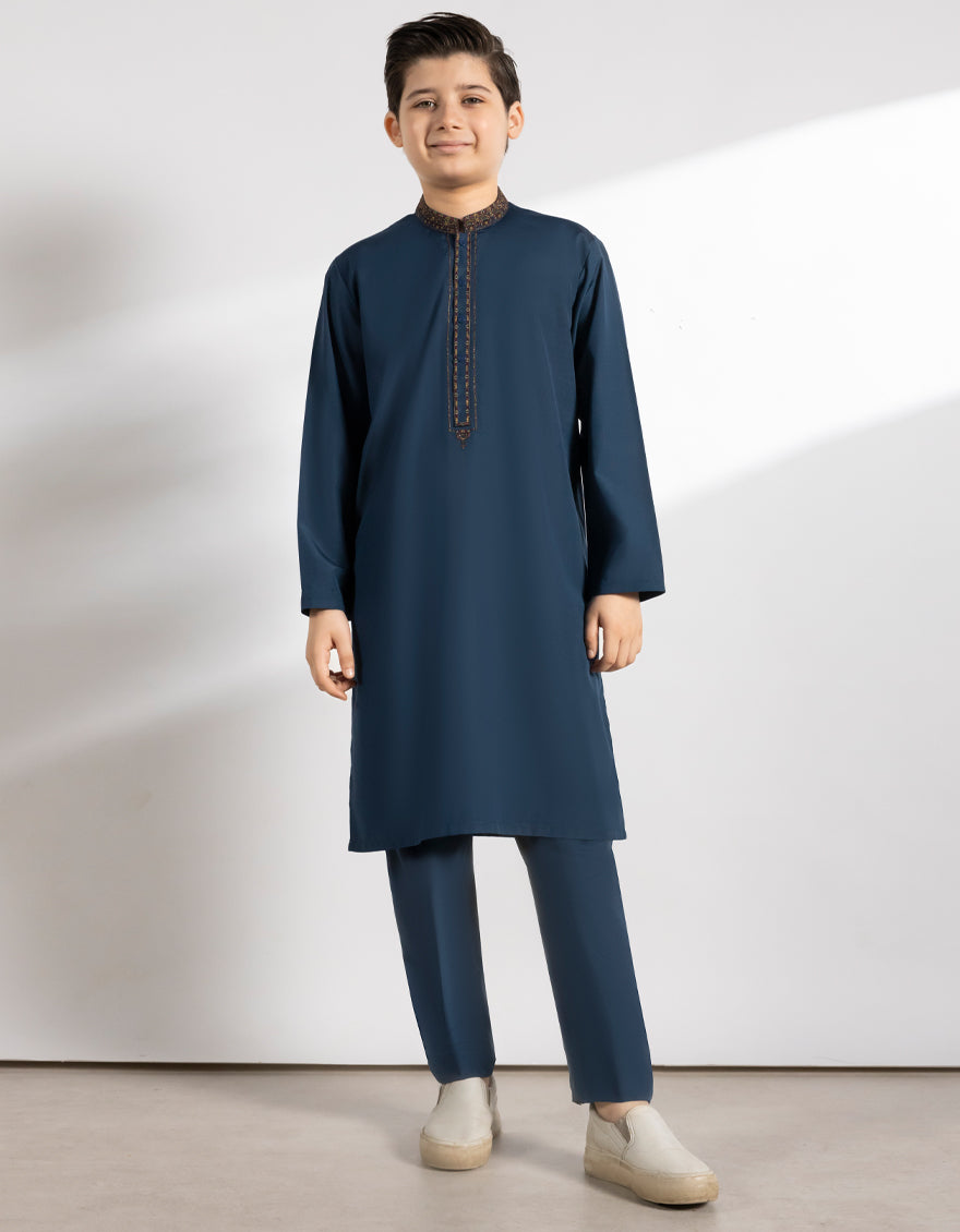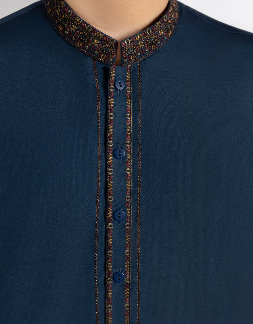 Designed for a sharper, more structured appearance, this Teal Blended Kurta Trousers set offers a modern fit with clean lines. The kurta features subtle detailing, while the straight-cut trousers ensure a neat silhouette. Perfect for events, workdays, or weekend wear.