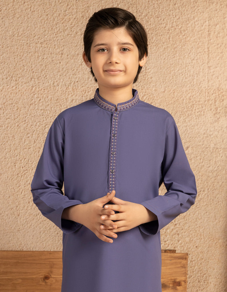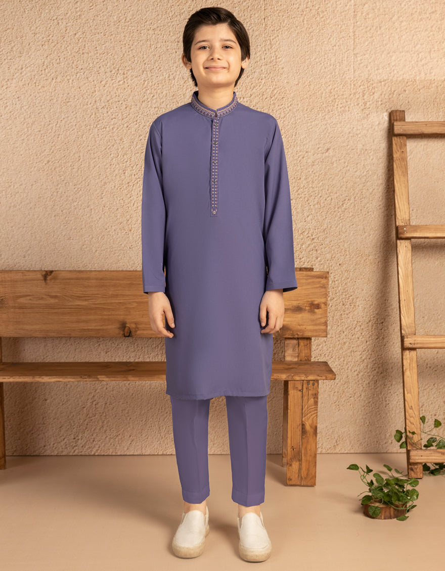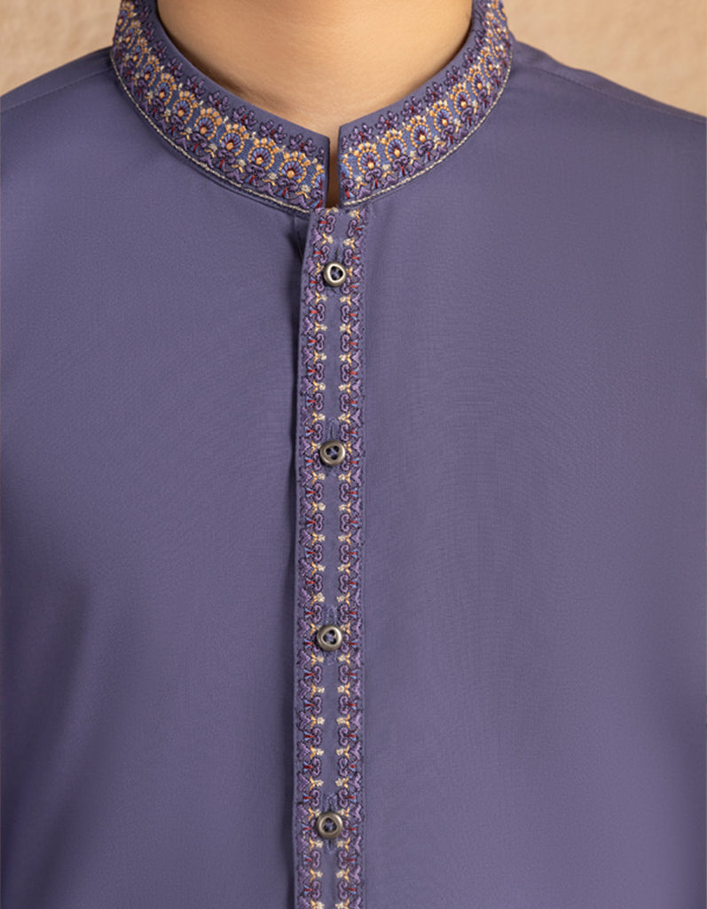 Designed with a refined touch, this purple blended semi-formal kurta trouser set offers a clean look that's ideal for small events, meetups, or evening wear.