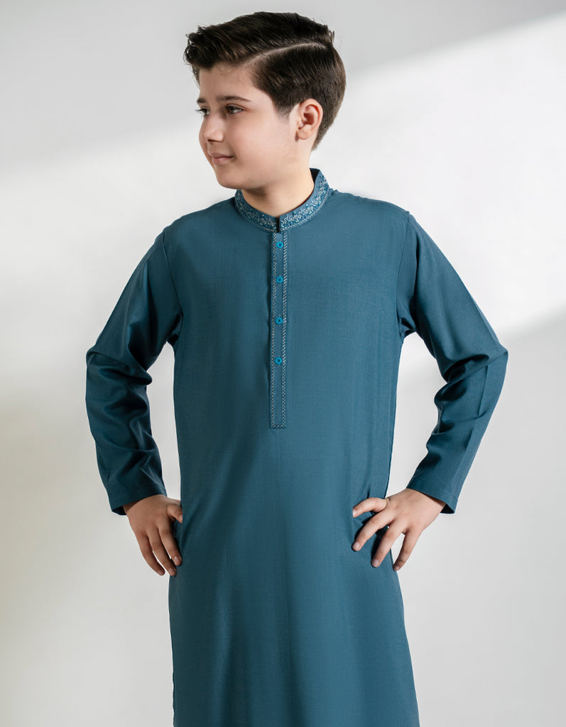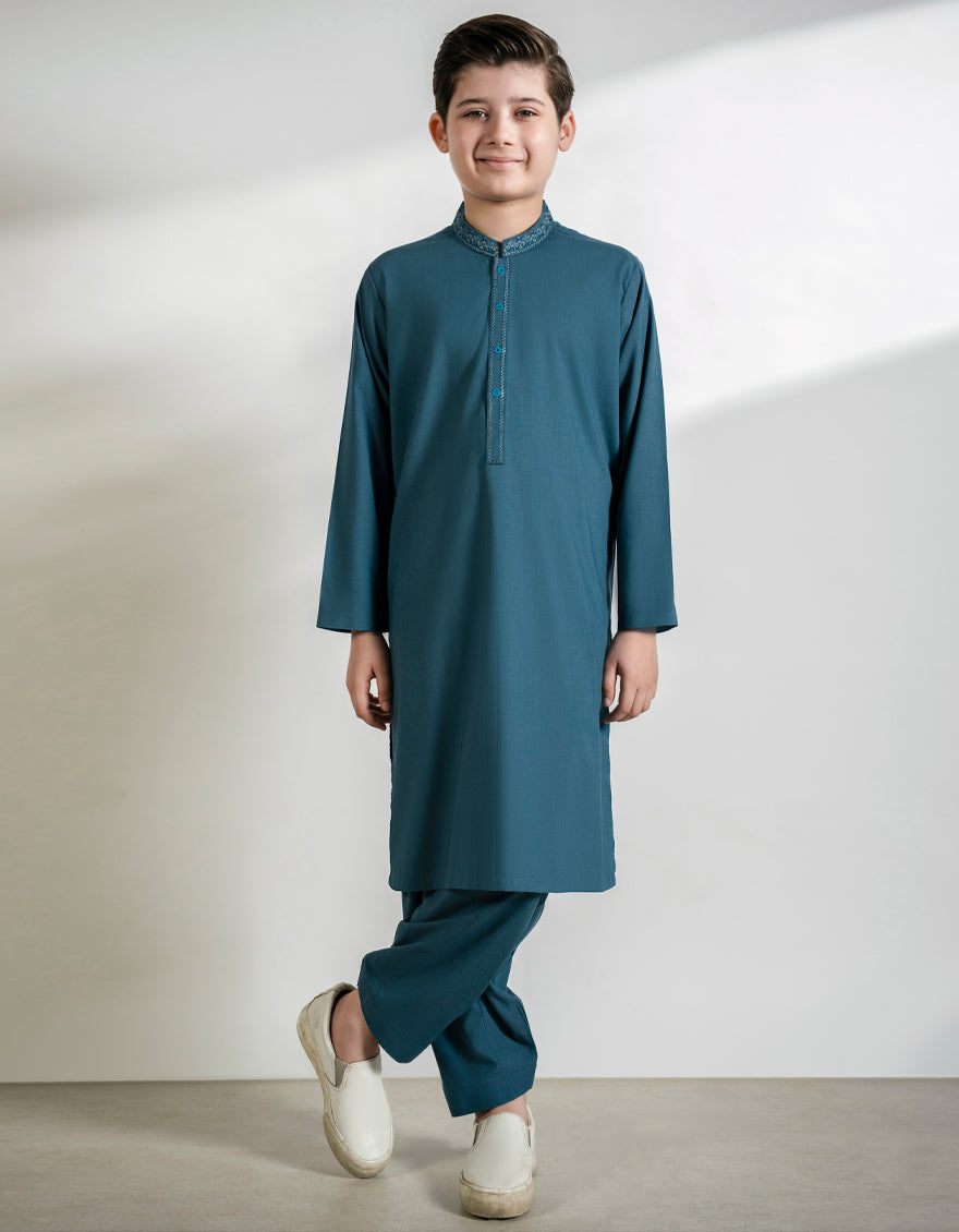 A comfortable and classic Teal Blue Blended Kameez Shalwar made for little boys. Easy to wear and perfect for everyday use. Neat stitching and a smart look keep your child looking tidy and well-dressed.