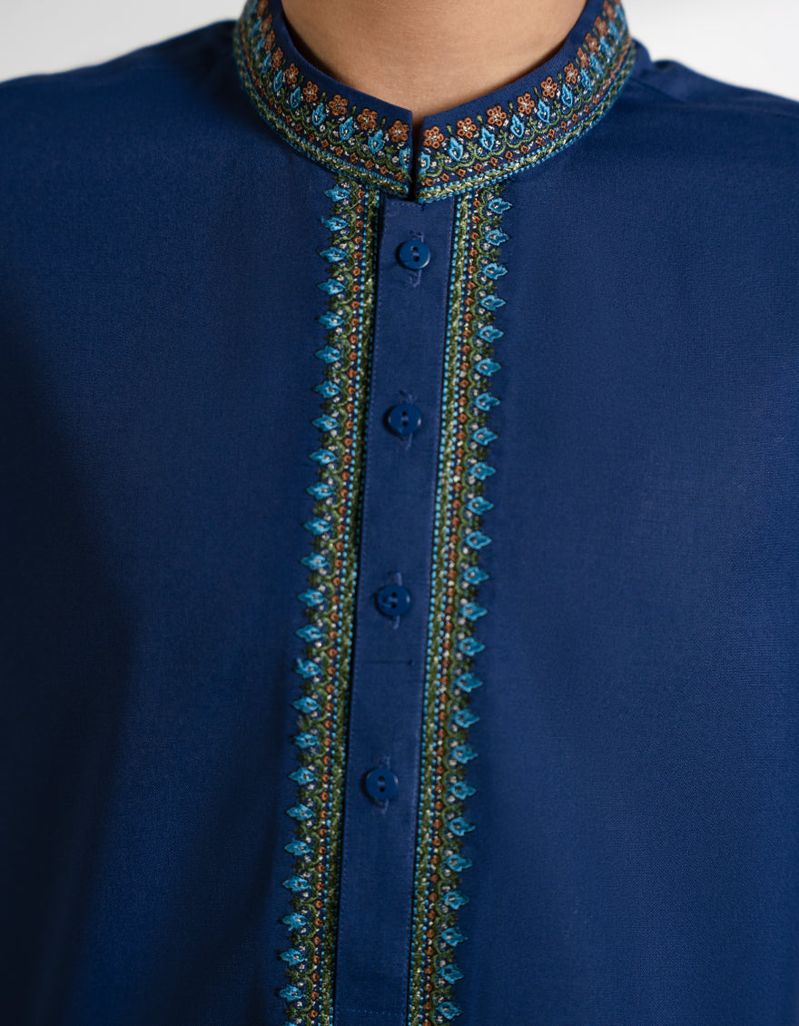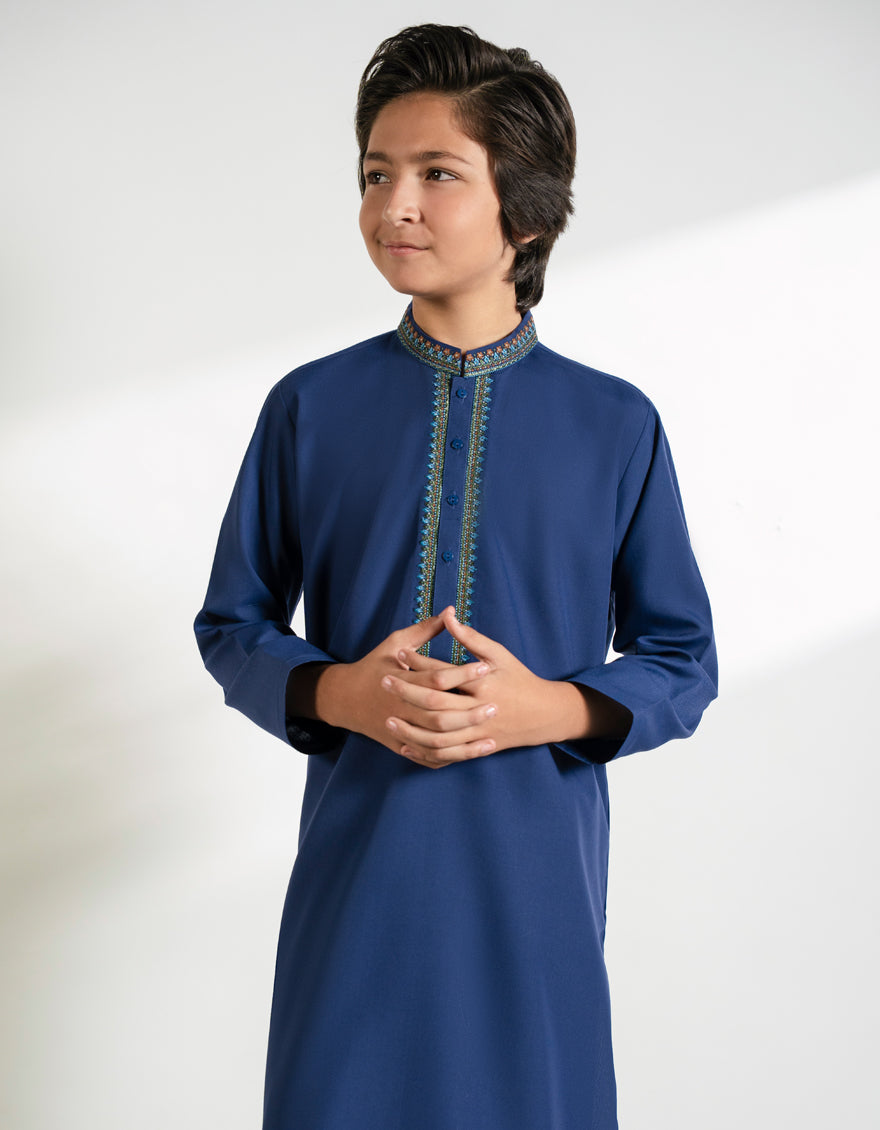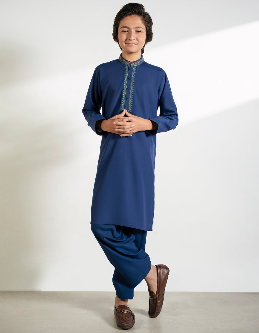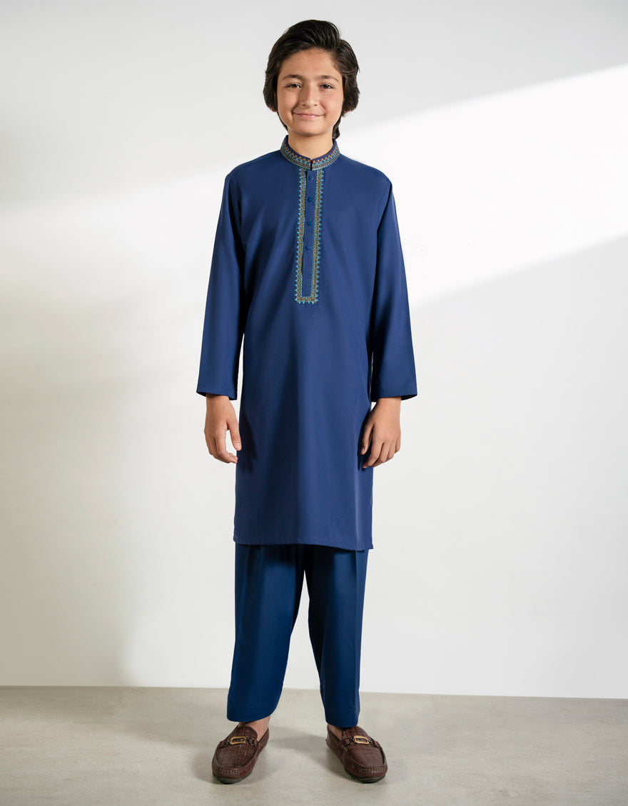 A comfortable and classic Blue Blended Kameez Shalwarmade for little boys. Easy to wear and perfect for everyday use. Neat stitching and a smart look keep your child looking tidy and well-dressed.
