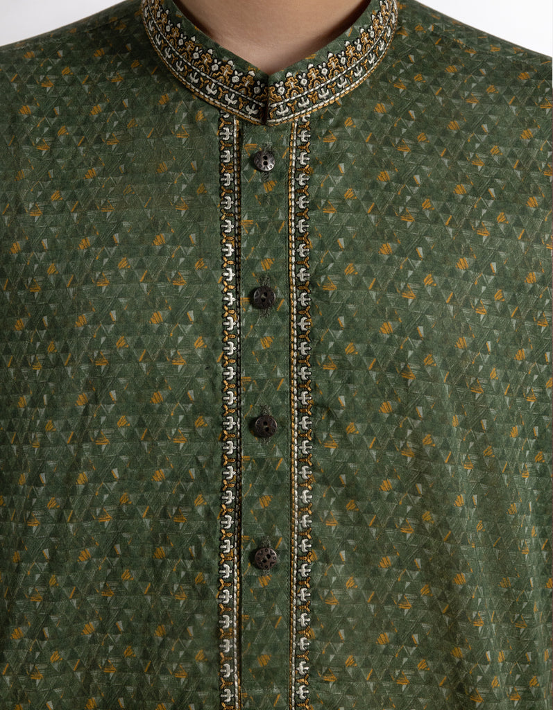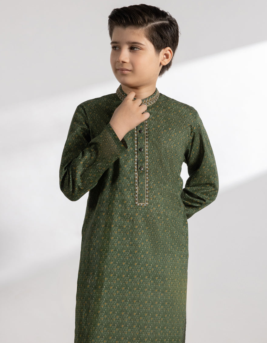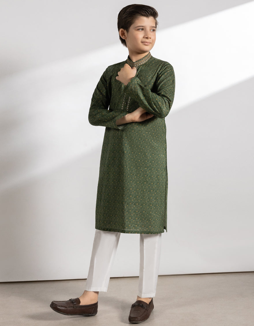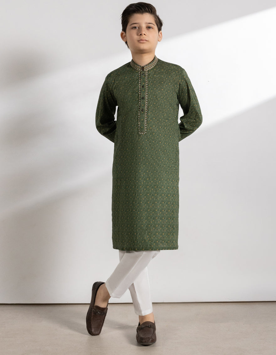 Introducing our kid boys' green cotton kurta, crafted with comfort in mind for your little ones. Let them explore and play in style with our comfortable and stylish kurtas.