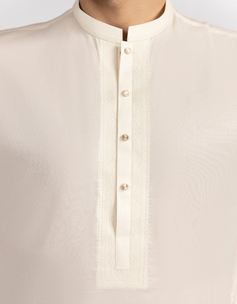 This Cream Cotton Semi-Formal Kurta combines elegance with simplicity. Finished with detailed stitching and smart button styling, it's ideal for semi-formal occasions or casual meetups. A versatile piece that carries both ease and refinement.