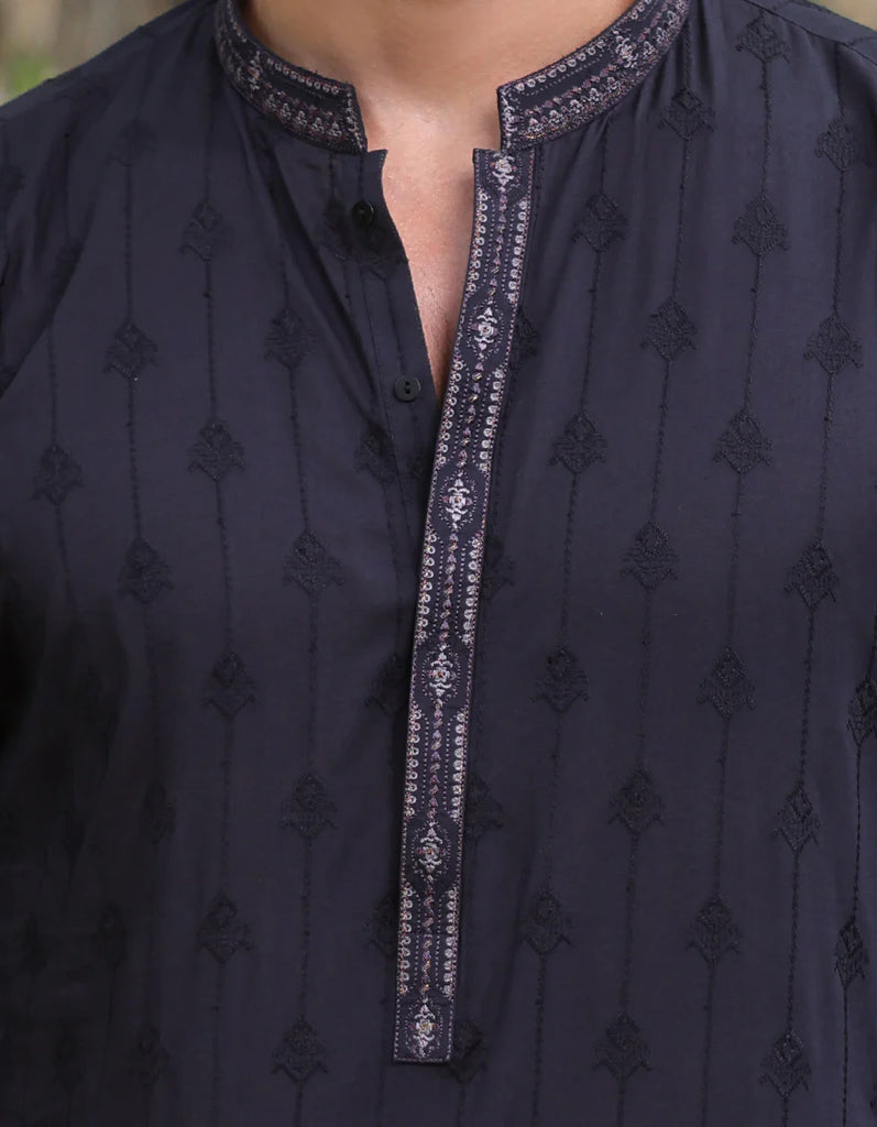 This black schiffli cotton formal kurta blends traditional style with a modern look. Made with care and clean design, it’s a great choice for weddings, events, or festive wear.