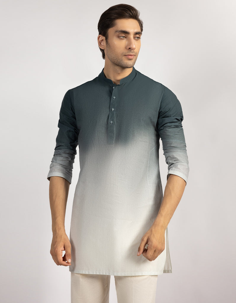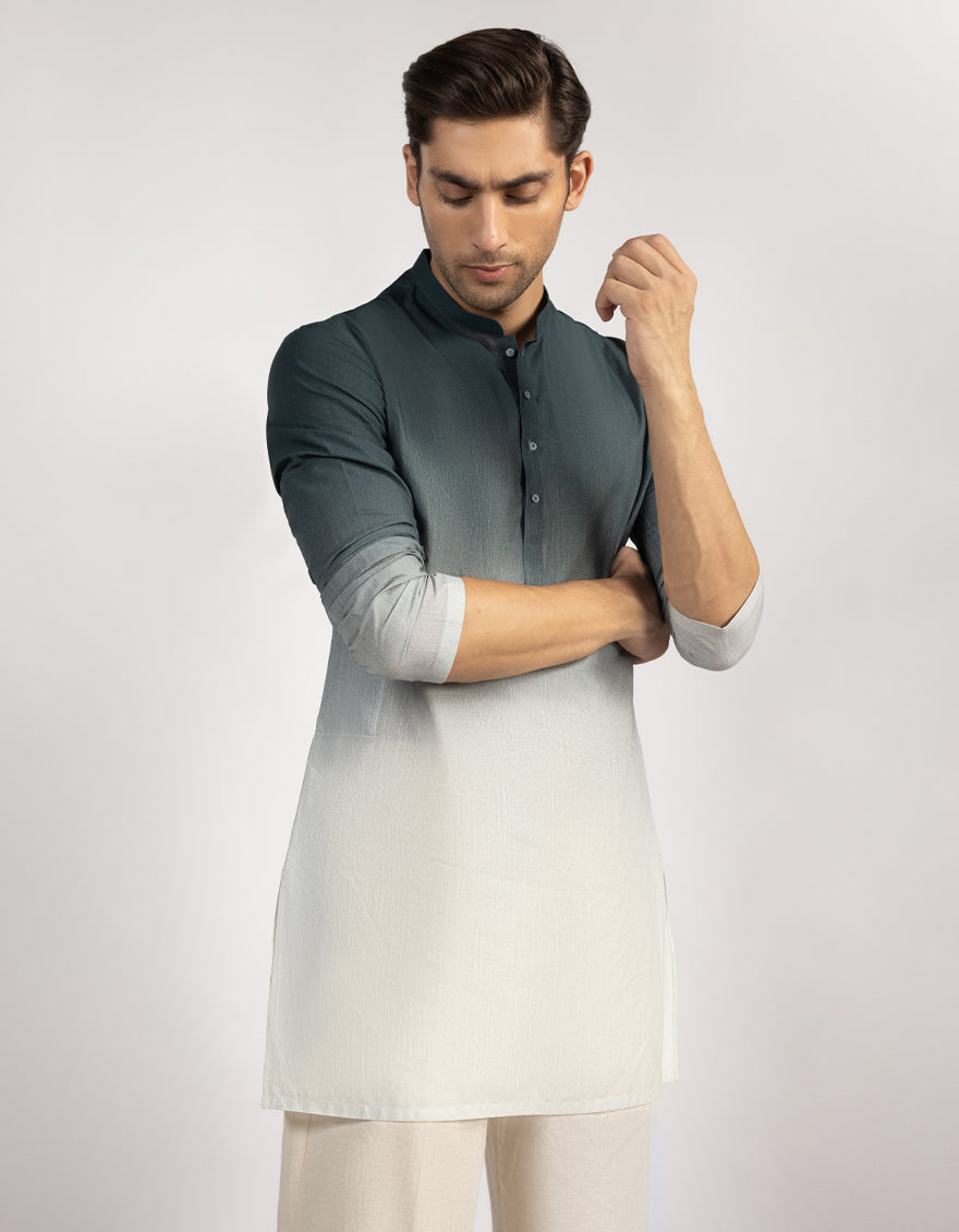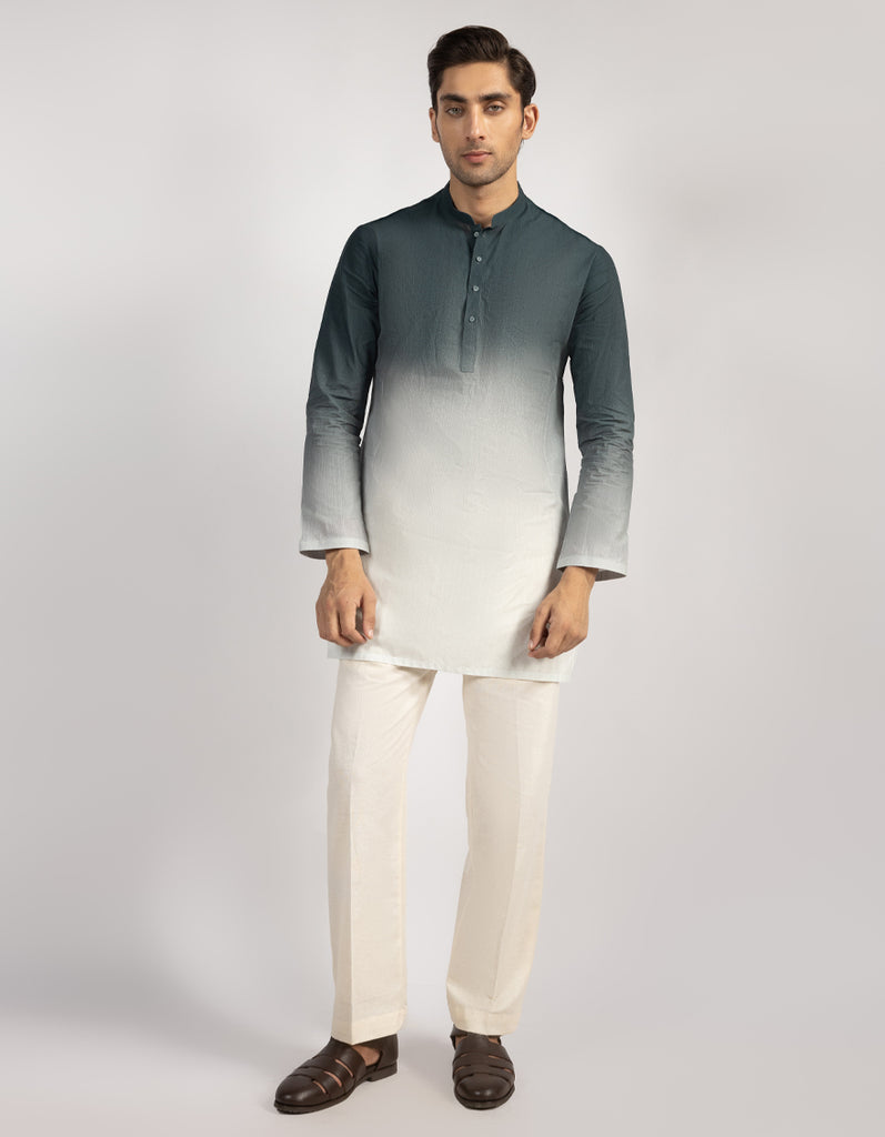 This Green Cotton Dip-Dye Casual Short Kurta combines elegance with simplicity. Finished with detailed stitching and smart button styling, it's ideal for semi-formal occasions or casual meetups. A versatile piece that carries both ease and refinement.