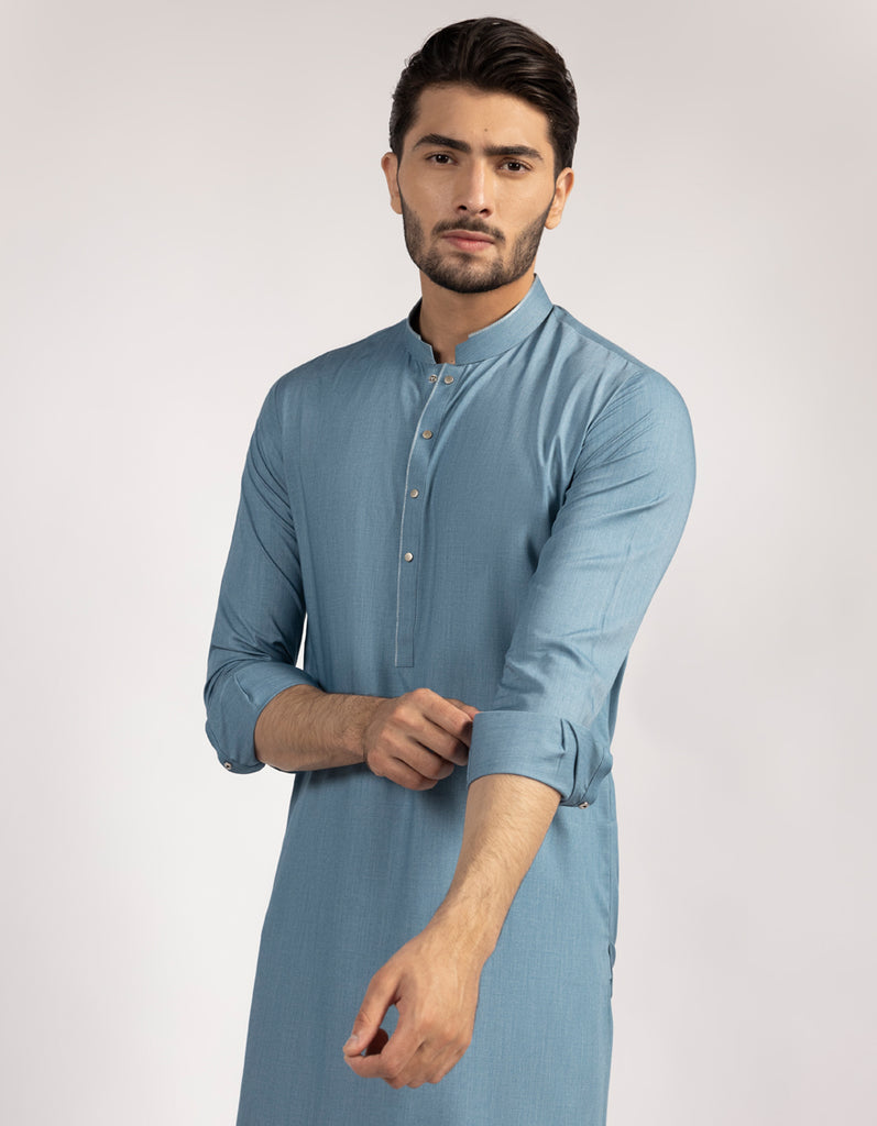 Designed for a sharper, more structured appearance, this Light Blue Blended Kurta Trousers set offers a modern fit with clean lines. The kurta features subtle detailing, while the straight-cut trousers ensure a neat silhouette. Perfect for events, workdays, or weekend wear.