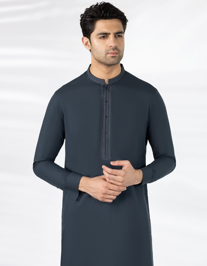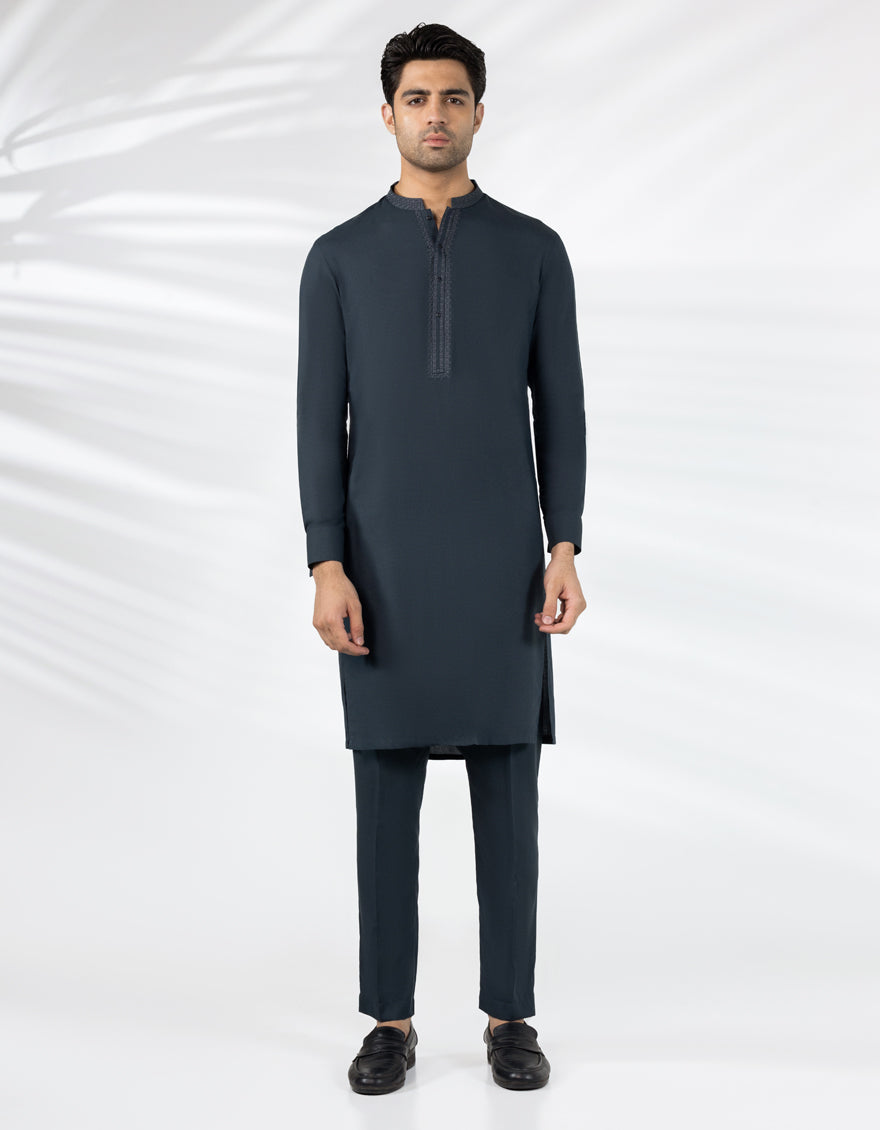 Designed for a sharper, more structured appearance, this Emerald Green Blended Kurta Trousers set offers a modern fit with clean lines. The kurta features subtle detailing, while the straight-cut trousers ensure a neat silhouette. Perfect for events, workdays, or weekend wear.