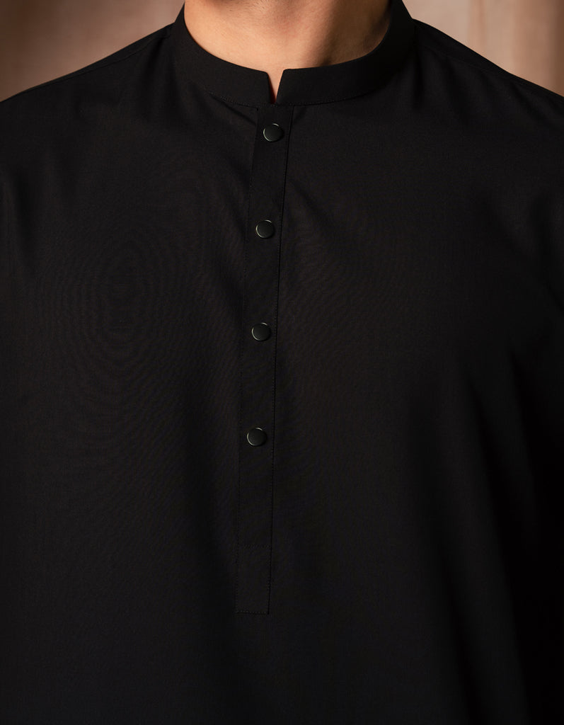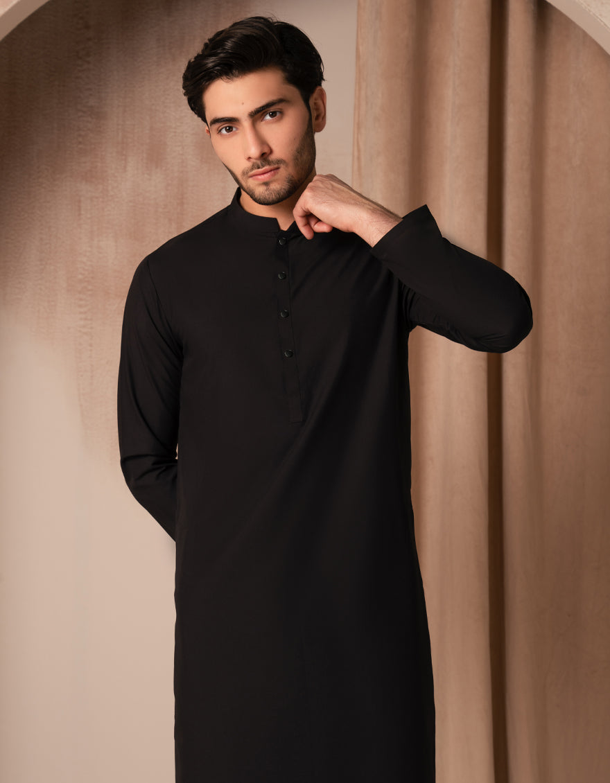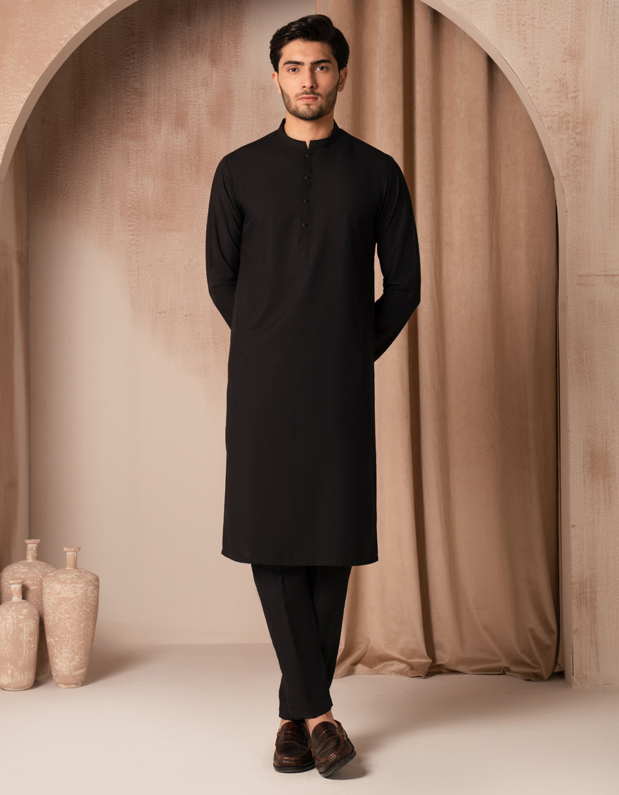 Designed for a sharper, more structured appearance, this Black Blended Kurta Trousers set offers a modern fit with clean lines. The kurta features subtle detailing, while the straight-cut trousers ensure a neat silhouette. Perfect for events, workdays, or weekend wear.