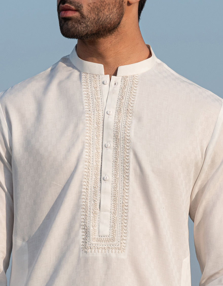 Stay comfortably stylish in this Off White Blended Formal Kurta, offering a classic design with a modern touch for a sophisticated look."