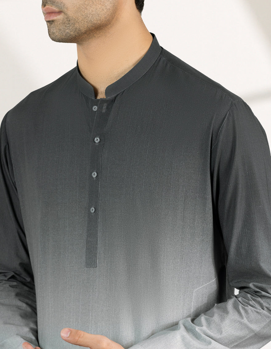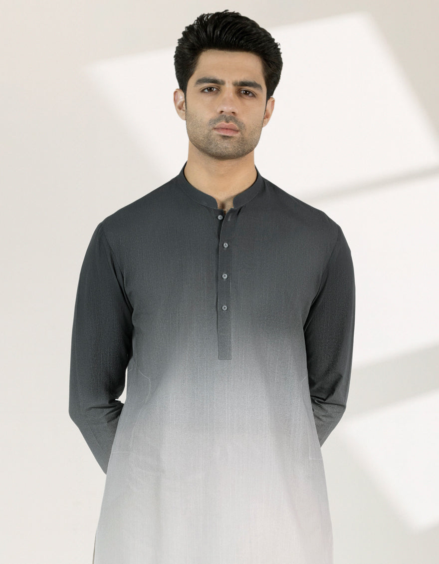 This Black Cotton Dip-Dye Casual Short Kurta combines elegance with simplicity. Finished with detailed stitching and smart button styling, it's ideal for semi-formal occasions or casual meetups. A versatile piece that carries both ease and refinement.