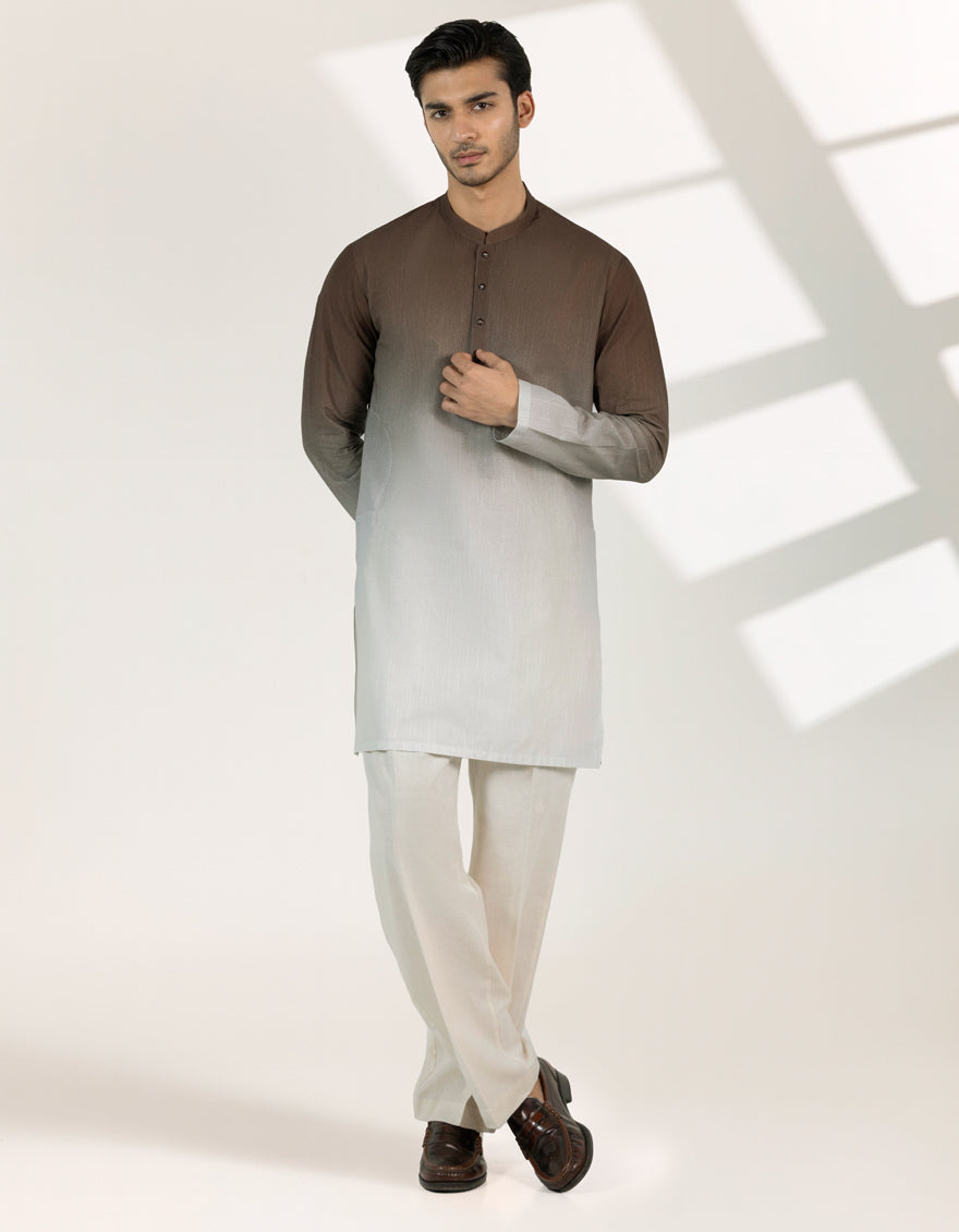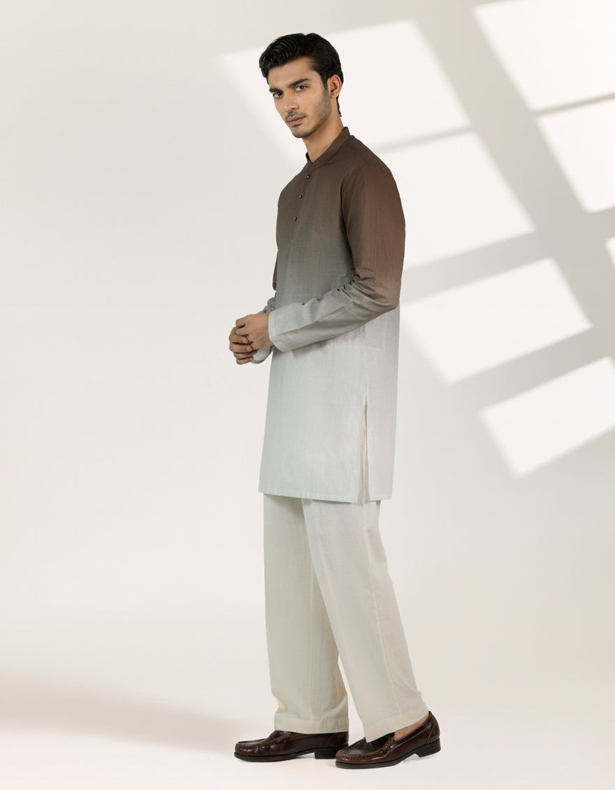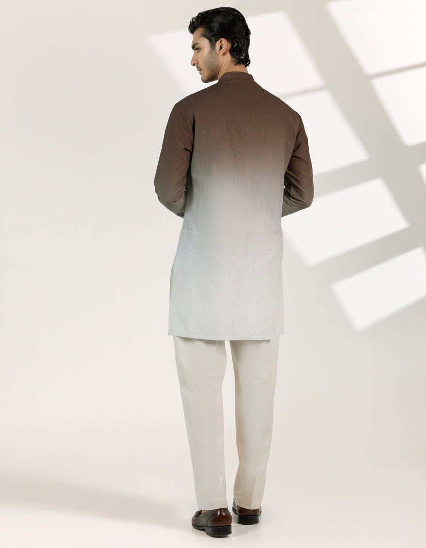 This Brown Cotton Dip-Dye Casual Short Kurta combines elegance with simplicity. Finished with detailed stitching and smart button styling, it's ideal for semi-formal occasions or casual meetups. A versatile piece that carries both ease and refinement.