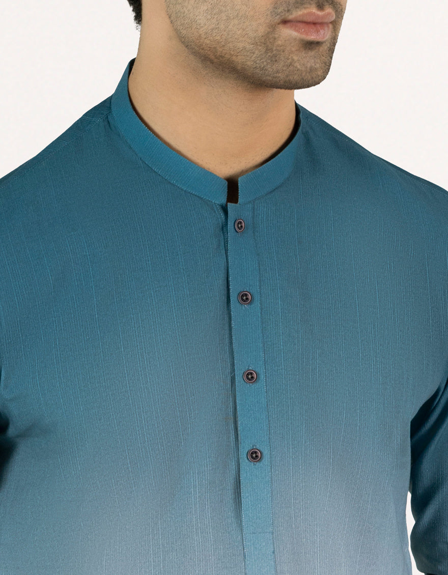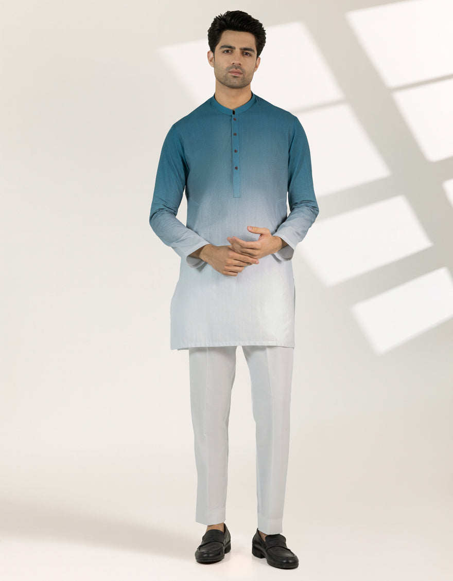 This Sky Blue Cotton Dip-Dye Casual Short Kurta combines elegance with simplicity. Finished with detailed stitching and smart button styling, it's ideal for semi-formal occasions or casual meetups. A versatile piece that carries both ease and refinement.