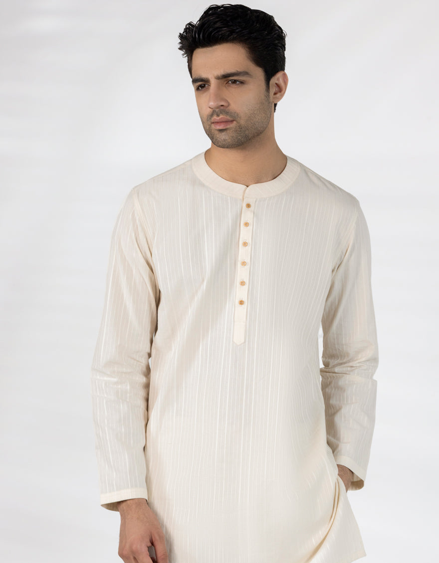 This Cream Cotton Casual Short Kurta combines elegance with simplicity. Finished with detailed stitching and smart button styling, it's ideal for semi-formal occasions or casual meetups. A versatile piece that carries both ease and refinement.