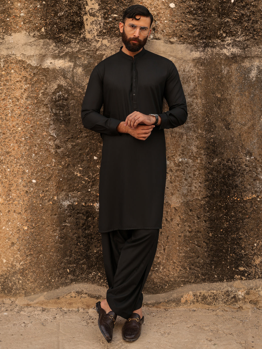 Black Kameez Shalwar With Band Collar And Embroidery Detail On The Placket.
