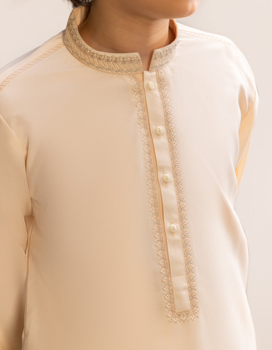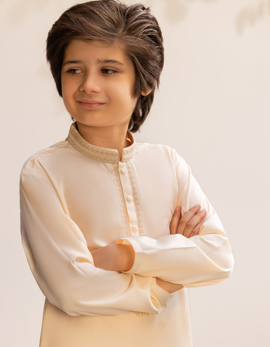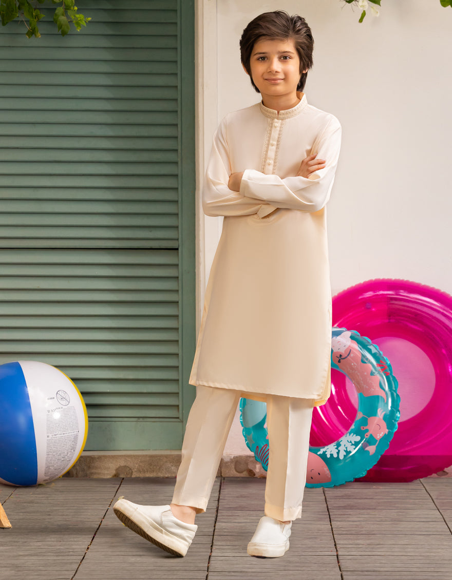 Made for the modern young man, this Light Peach Polyester Kurta Trouser is a perfect blend of style and comfort. Its simple yet elegant design makes it suitable for a range of occasions, ensuring that your little one looks his best