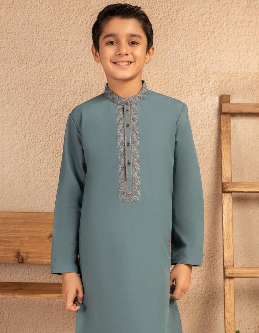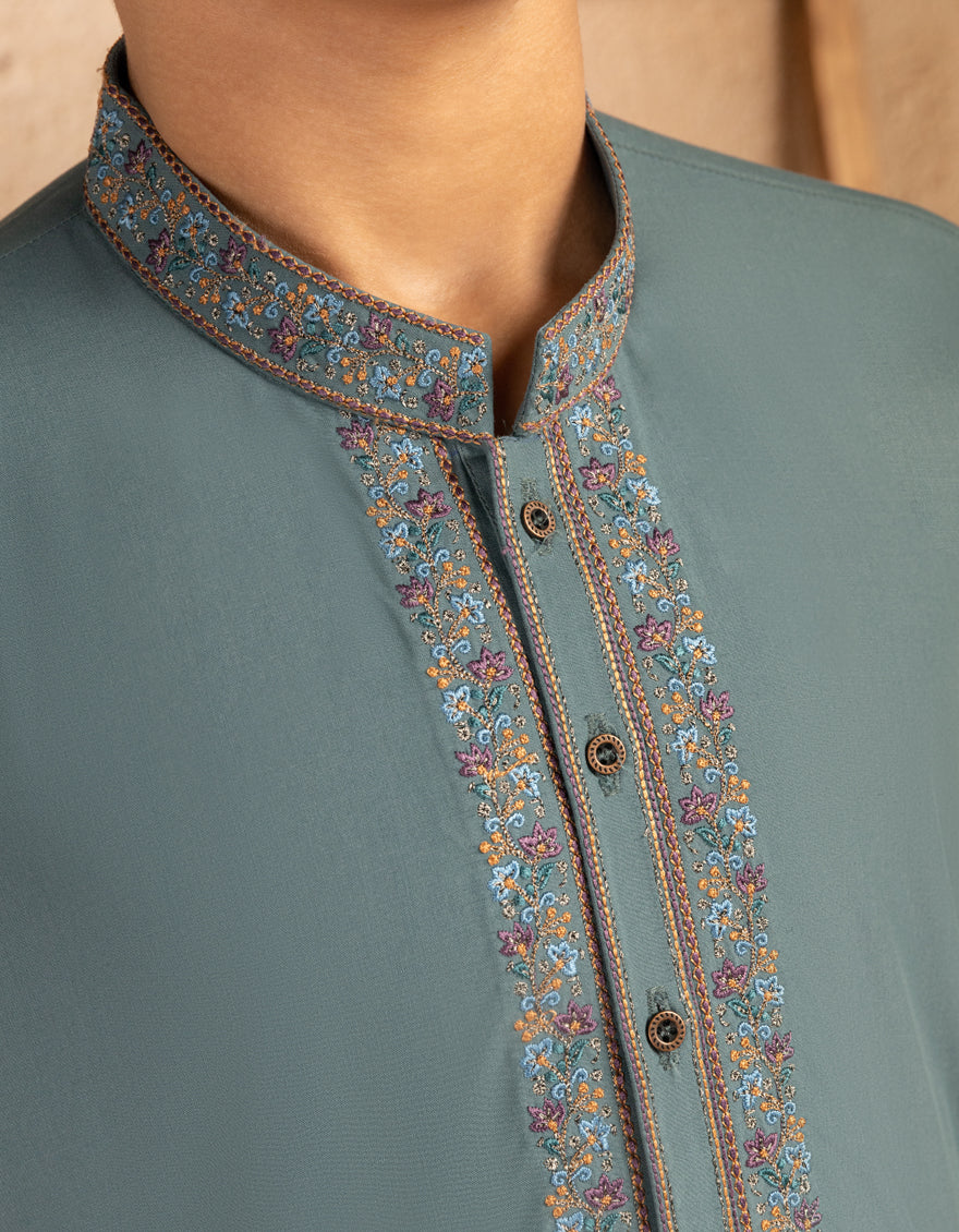 A polished and well-finished green blended formal kurta trouser set, made to suit formal settings, special gatherings, or traditional occasions.