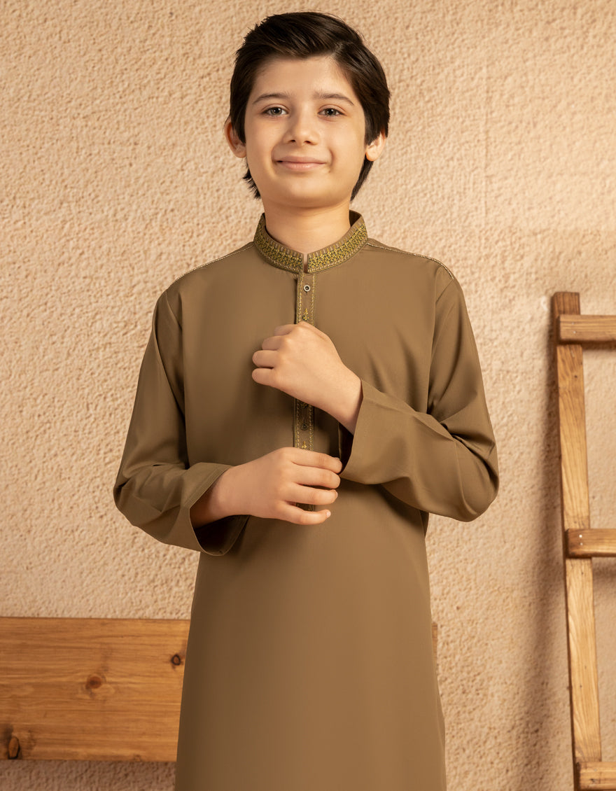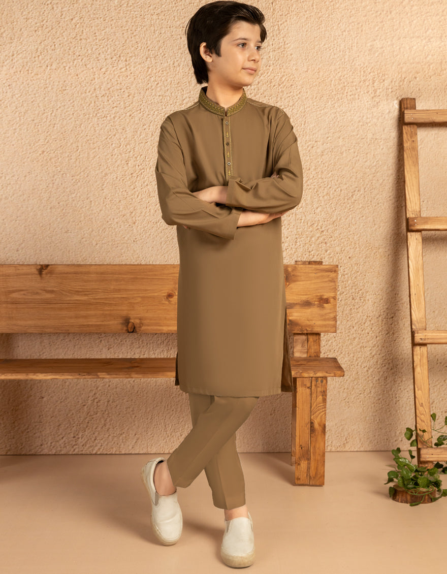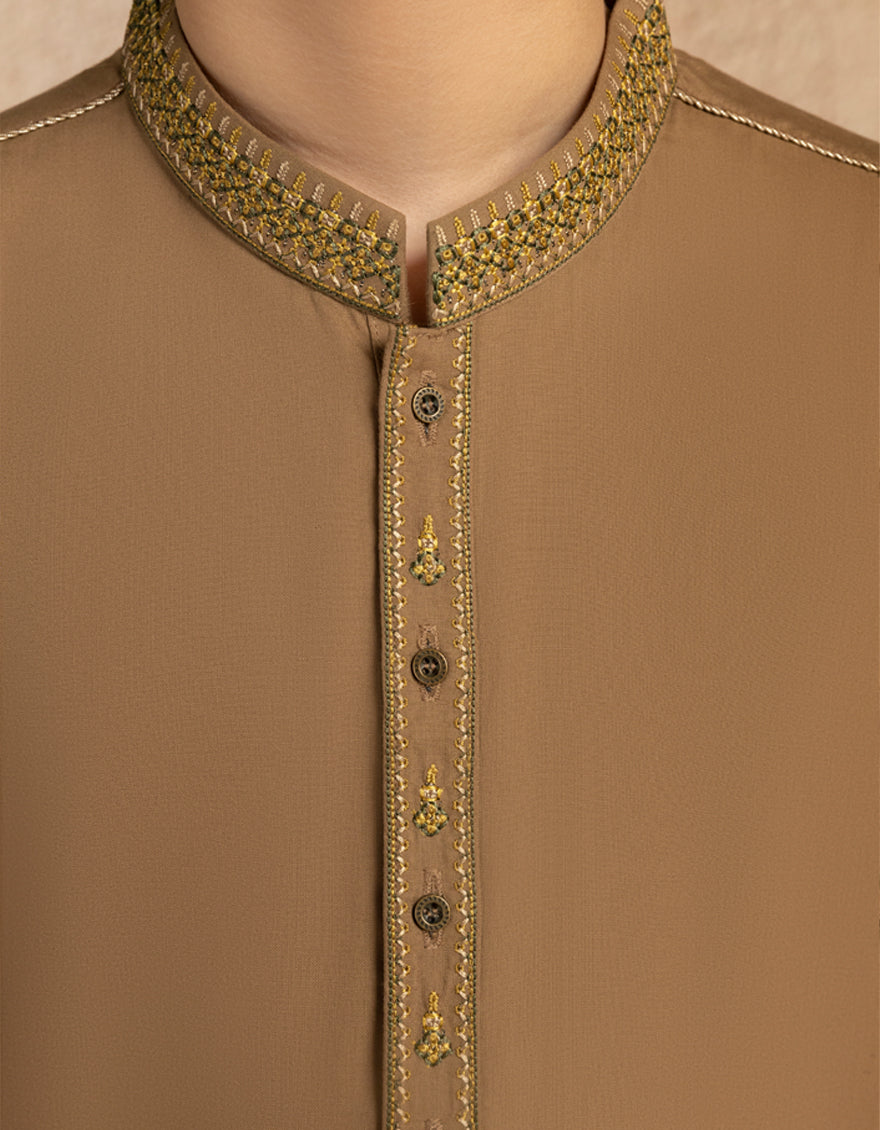 Designed with a refined touch, this mustard blended semi-formal kurta trouser set offers a clean look that's ideal for small events, meetups, or evening wear.