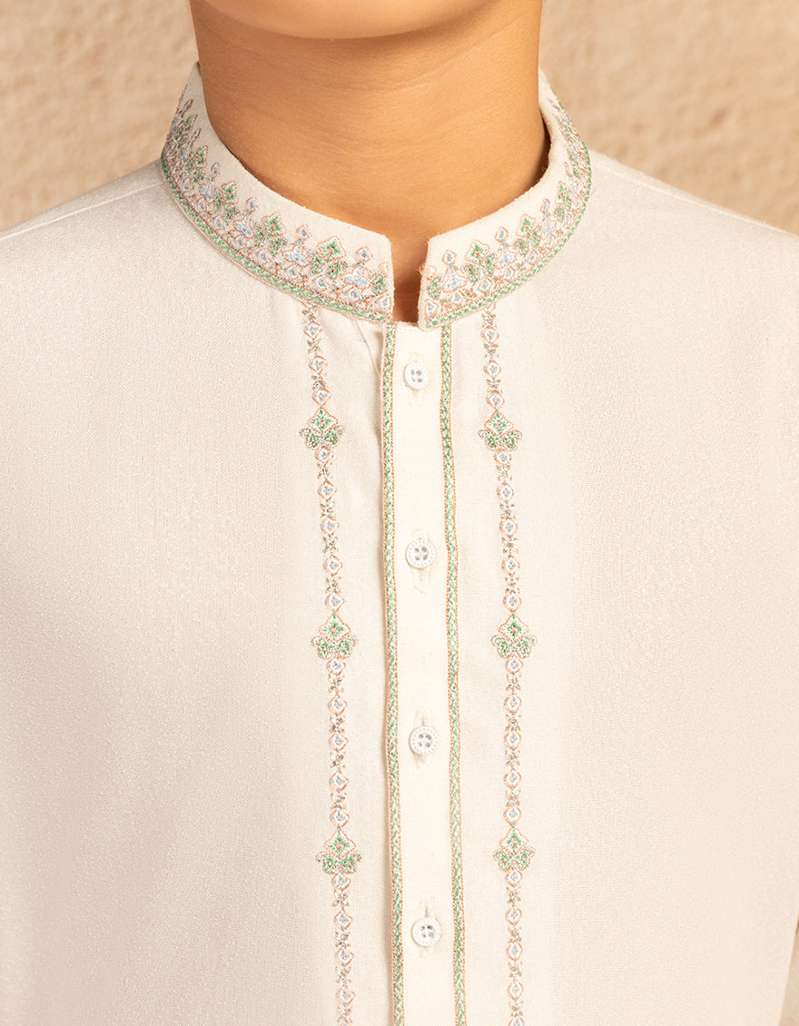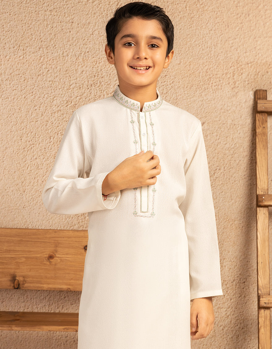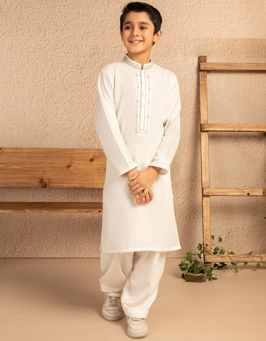 Introducing our kid boys' off white blended formal kameez shalwar, crafted with comfort in mind for your little ones. Let them explore and play in style with our comfortable and stylish outfit.