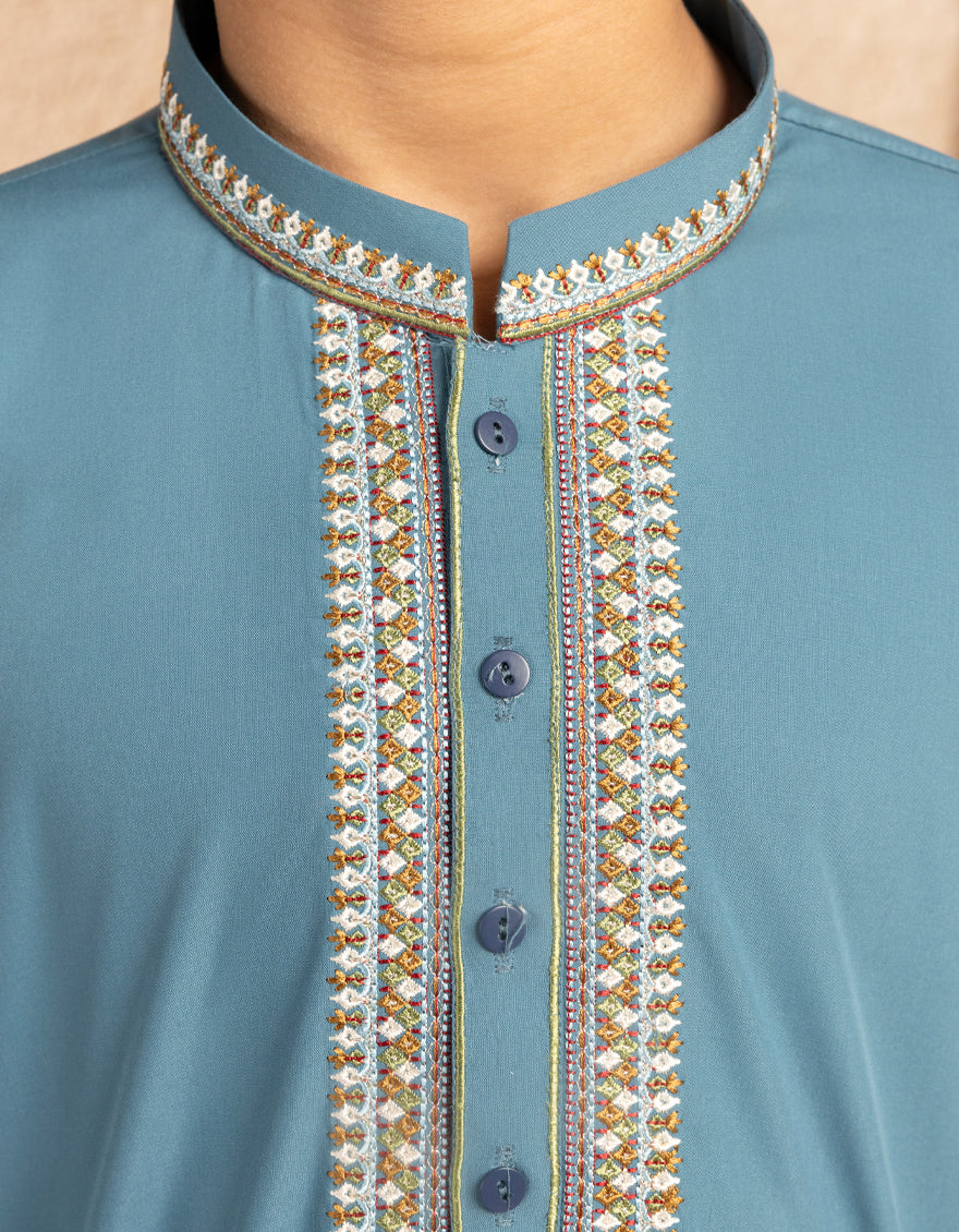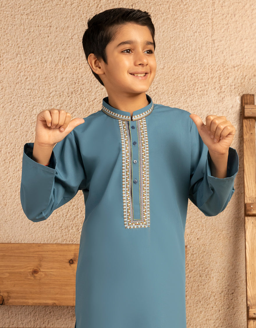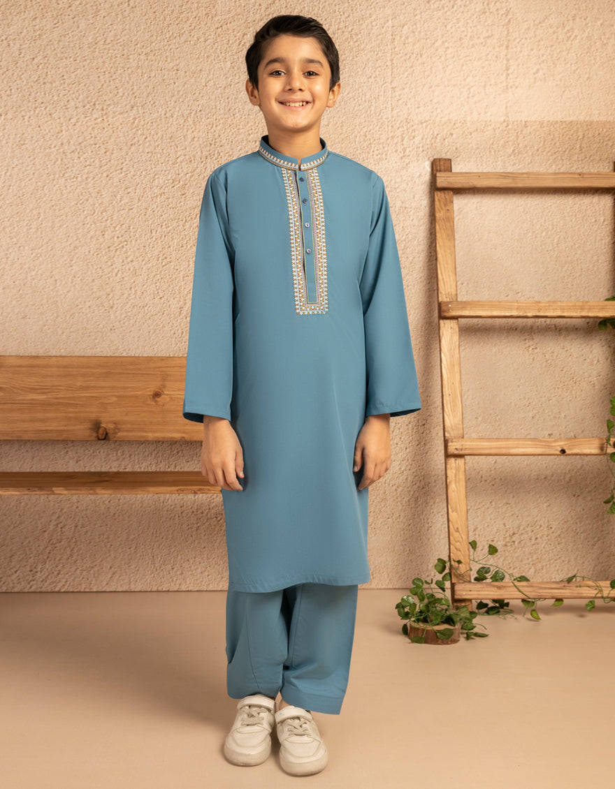 Traditional and simple, this dull blue blended formal kameez shalwar is a perfect blend of style and comfort. Its simple yet elegant design makes it suitable for a range of occasions, ensuring that your little one looks his best.