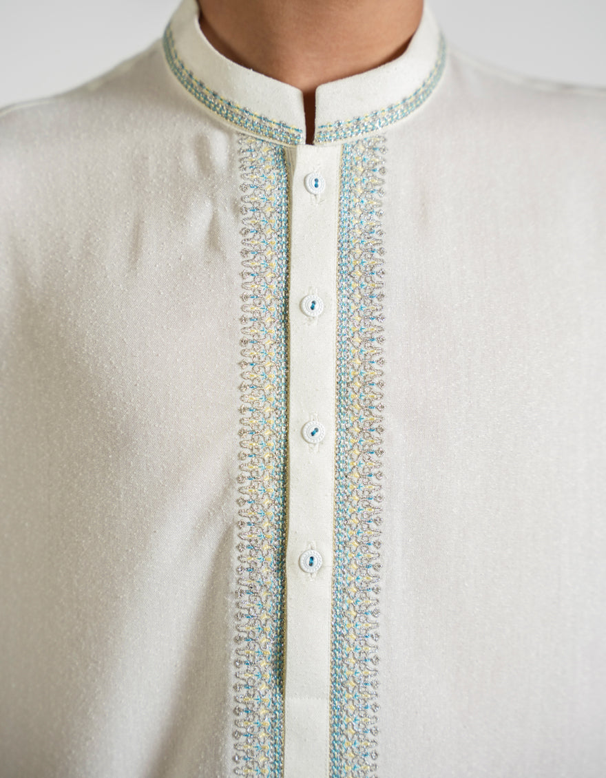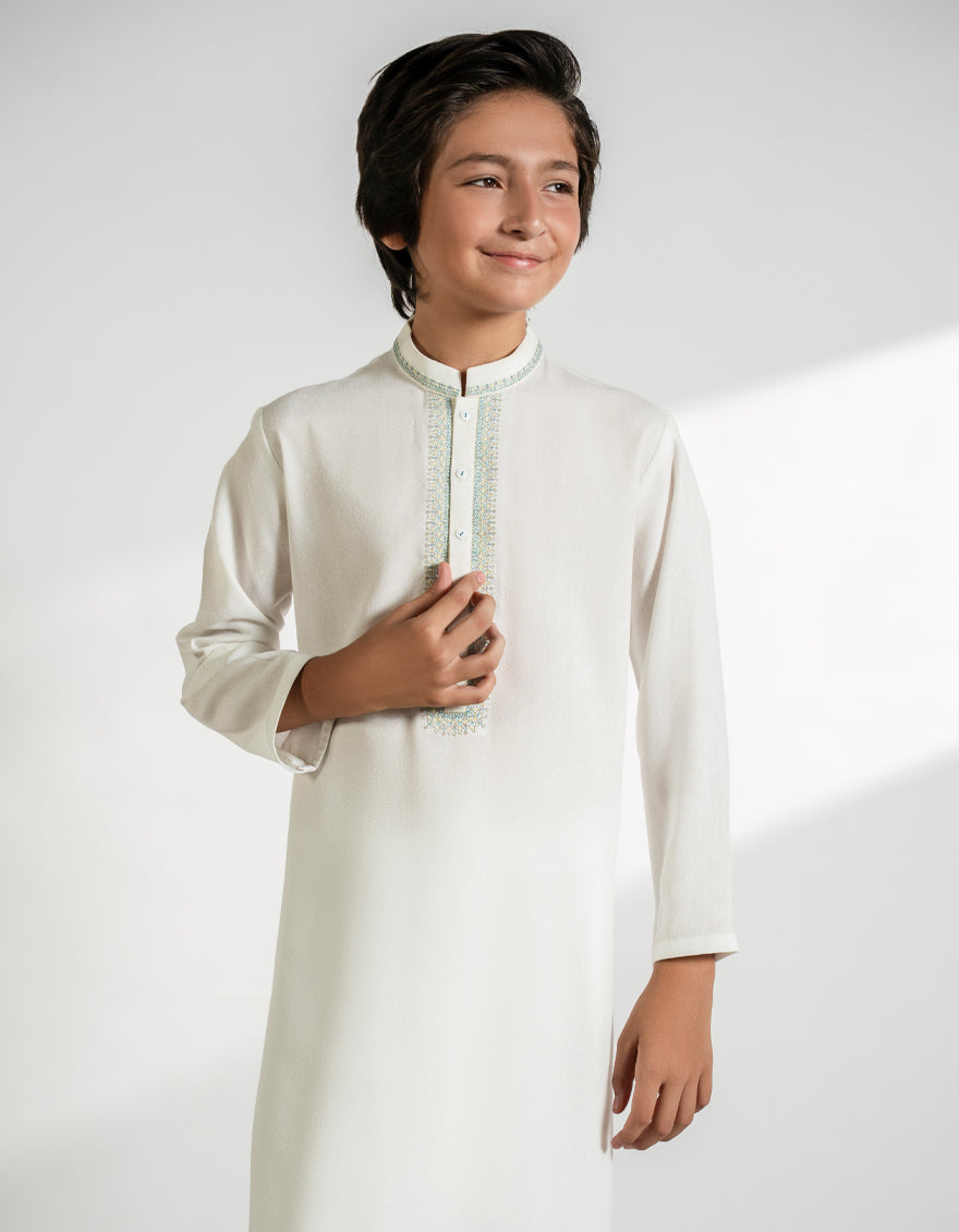 A comfortable and classic Off White Blended Kameez Shalwarmade for little boys. Easy to wear and perfect for everyday use. Neat stitching and a smart look keep your child looking tidy and well-dressed.