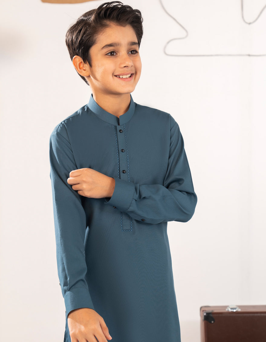 Made for the modern young man, this Teal Blended Kameez Shalwar is a perfect blend of style and comfort. Its simple yet elegant design makes it suitable for a range of occasions, ensuring that your little one looks his best.