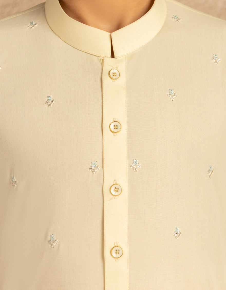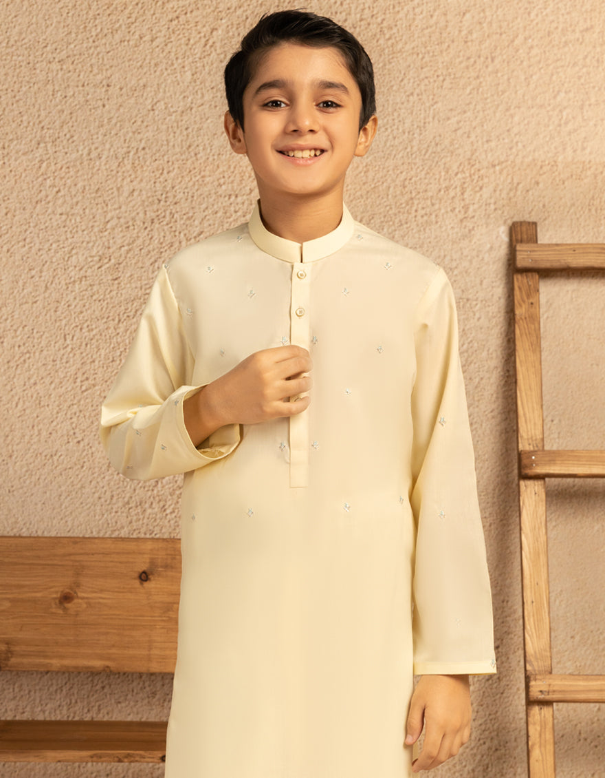 Simple and comfortable, this cream blended semi-formal kameez shalwar is a perfect blend of style and comfort. Its simple yet elegant design makes it suitable for a range of occasions, ensuring that your little one looks his best.