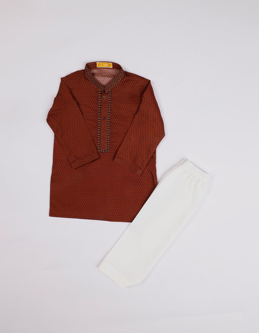 Made for comfort and ease, this Rust Cotton Printed Kameez Shalwar features soft stitching and a gentle design touch. The subtle patterns and button details add a graceful look without causing any fuss. Ideal for little ones who need free movement with a neat appearance.