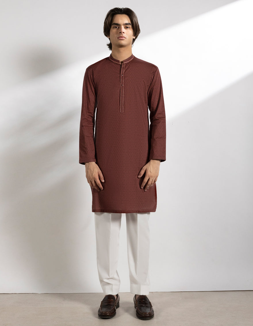 Designed with the young gentleman in mind, this maroon cotton semi-formal kurta exudes charm and sophistication. Its classic yet stylish look offers versatility, perfect for both casual and formal occasions.