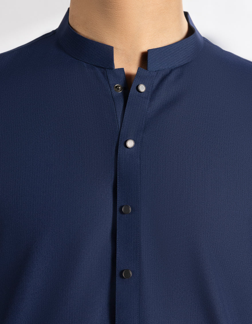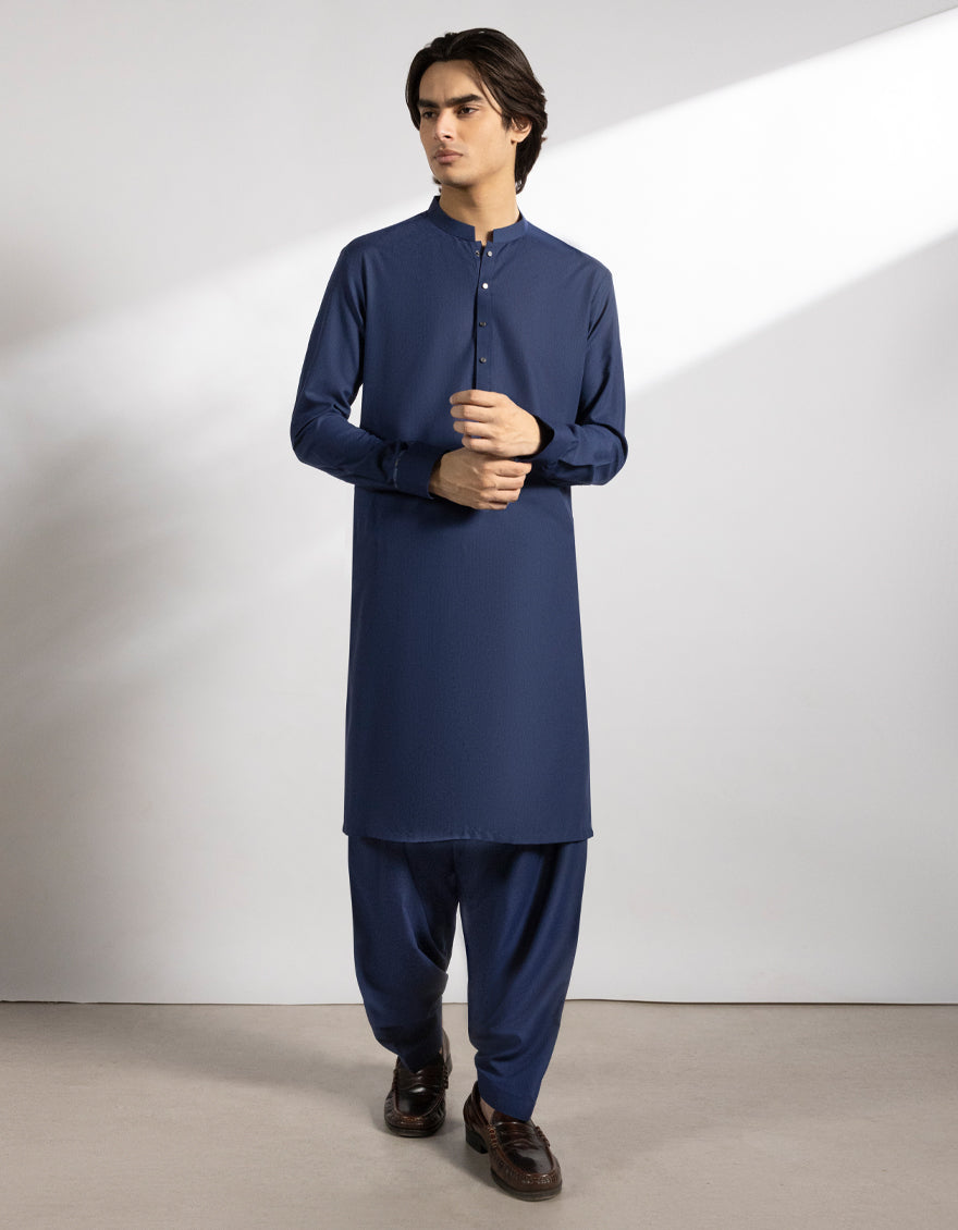 This Blue Blended Kameez Shalwarstands out with its fine stitching and a unique touch of design. Subtle patterns and smart button detailing add to its appeal. A graceful pick that blends decency with a stylish look.