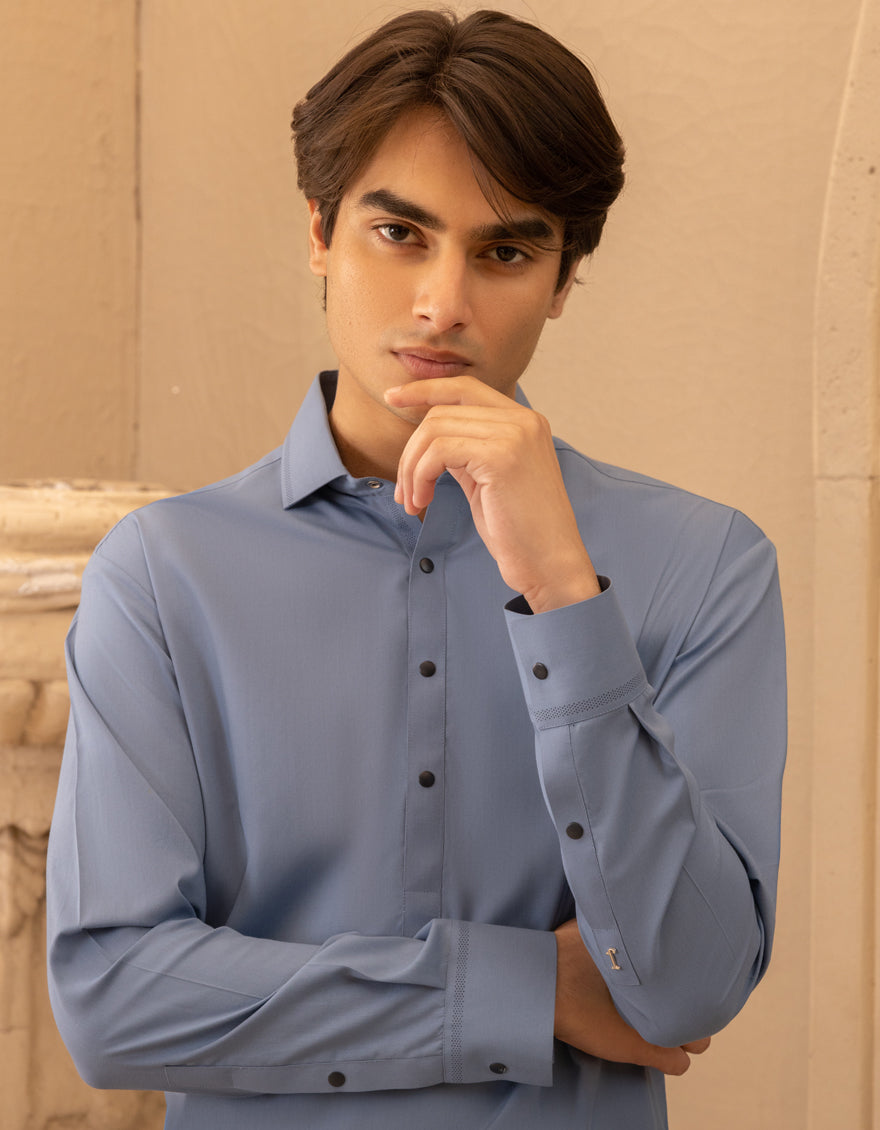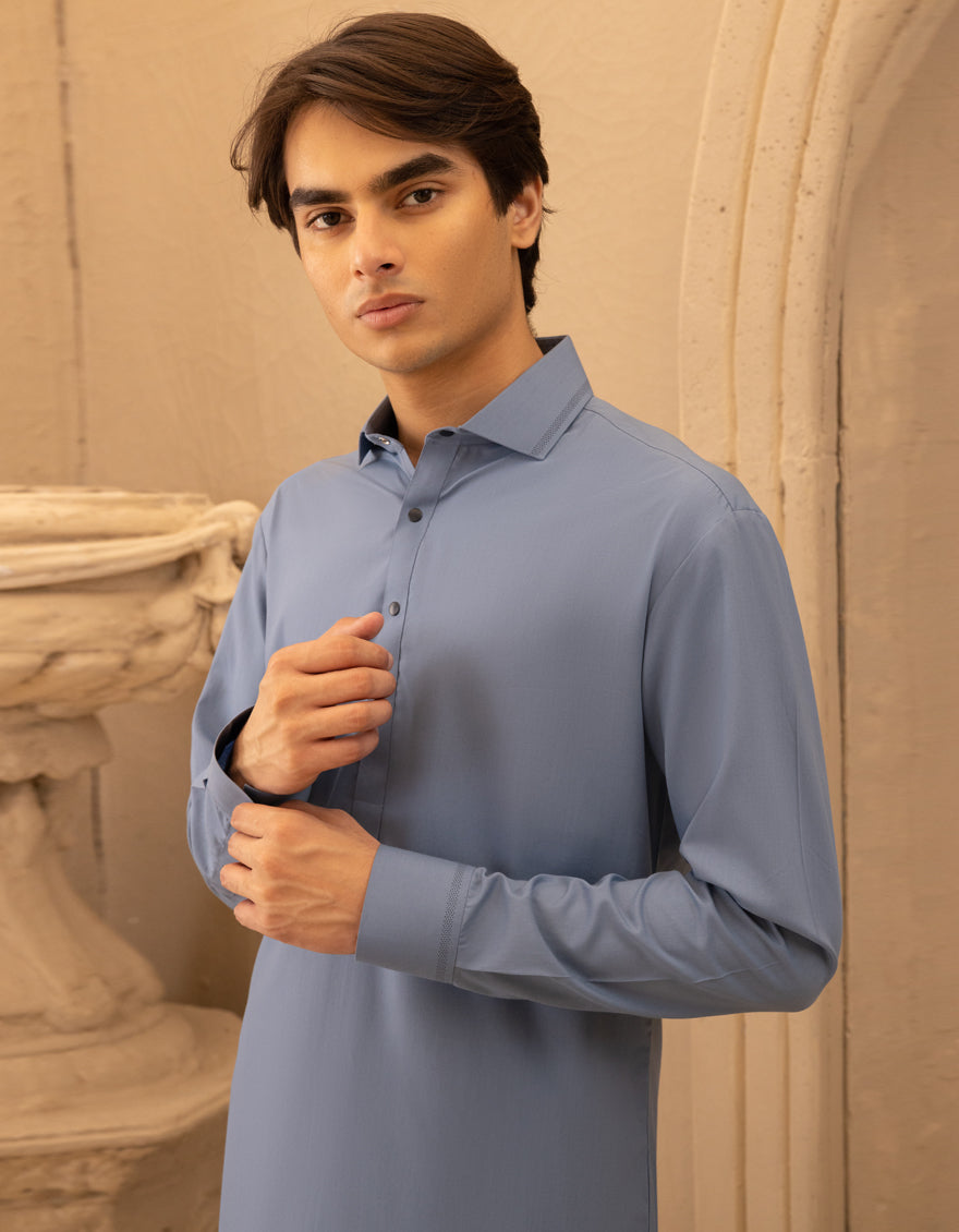 Designed with the young gentleman in mind, this dull blue blended formal kameez shalwar exudes charm and sophistication. Its classic yet stylish look offers versatility, perfect for both casual and formal occasions.