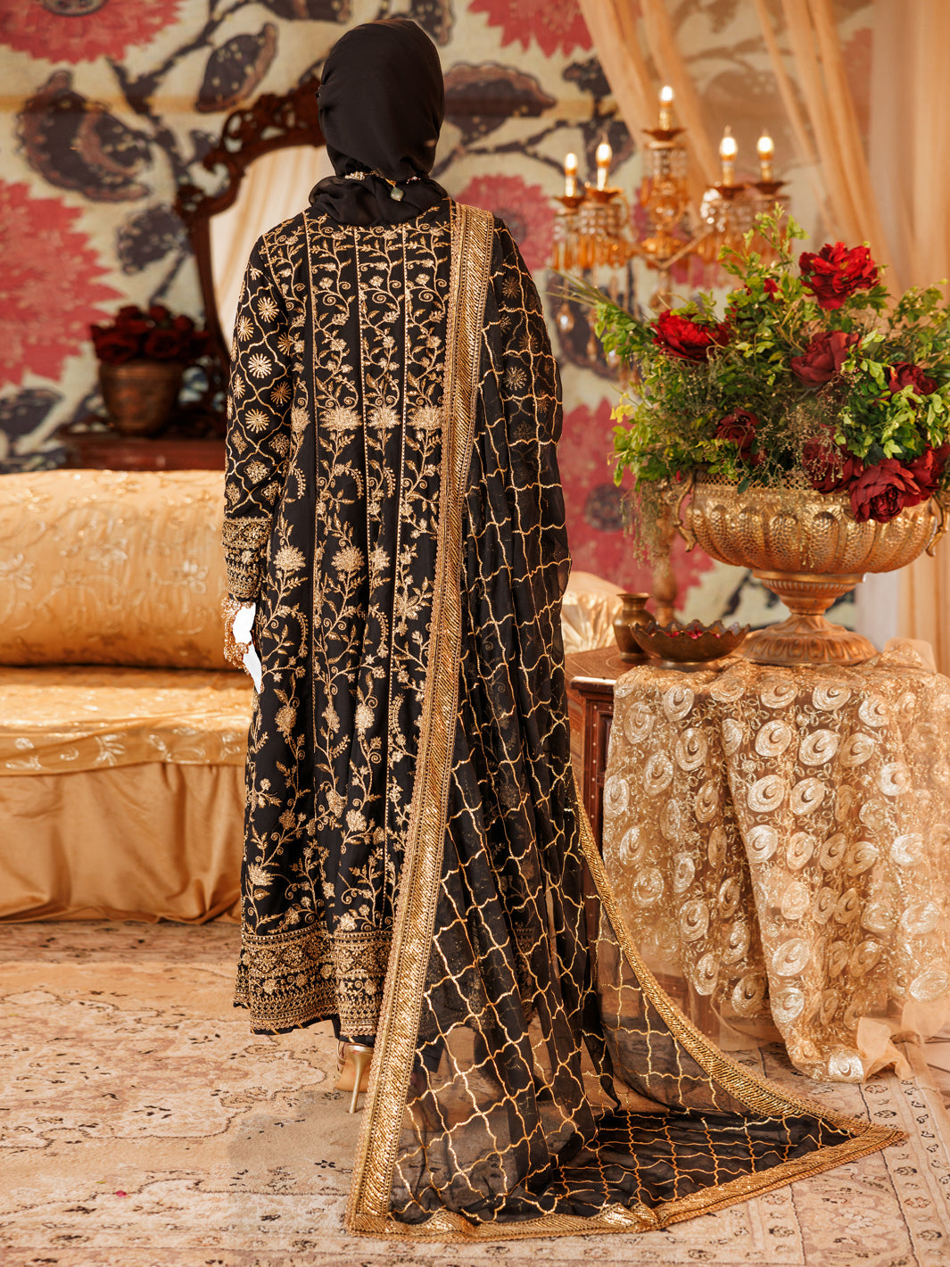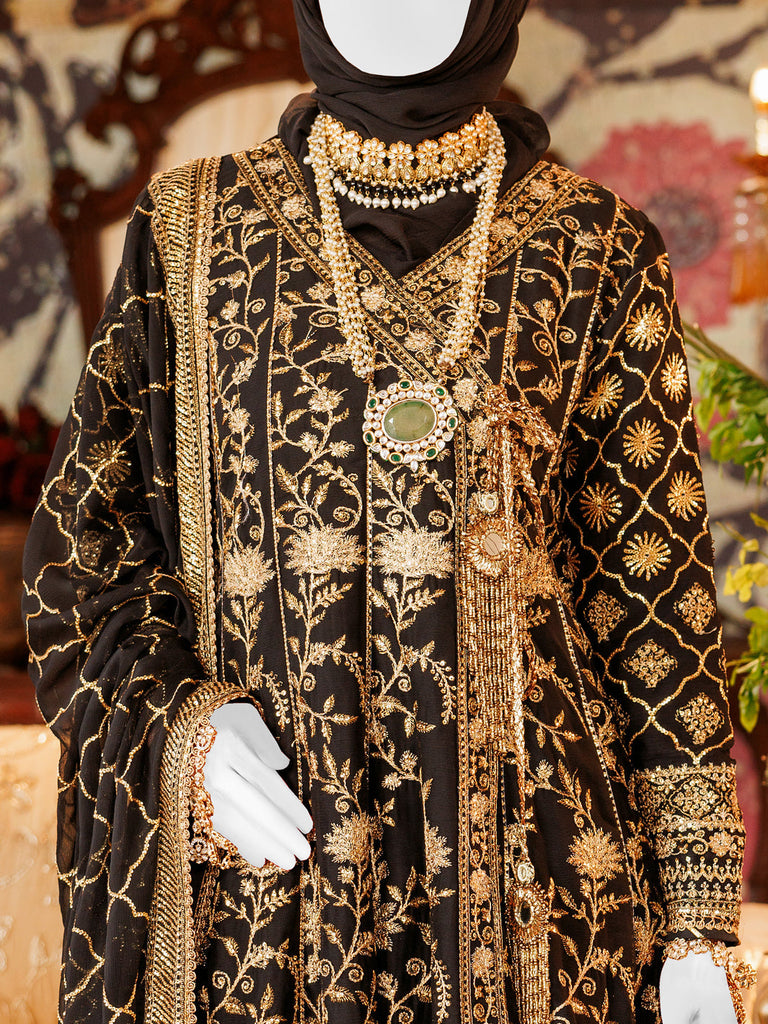 Showcasing intricate gold embroidery that shimmers like gold and makes you feel like a queen. Immerse yourself in the mystique of our Black Angrakha, a luxe regal piece that weaves a tale of elegance with gold zari work and sequins that resemble a harmonious blend of tradition and modish culture.