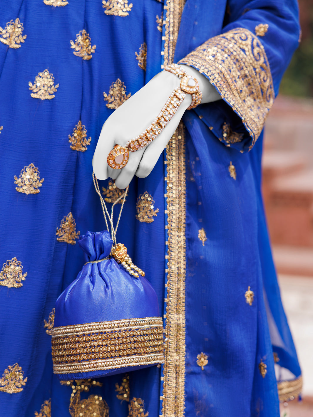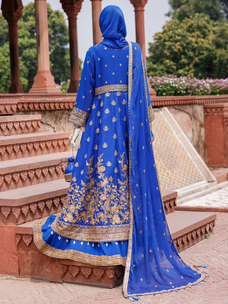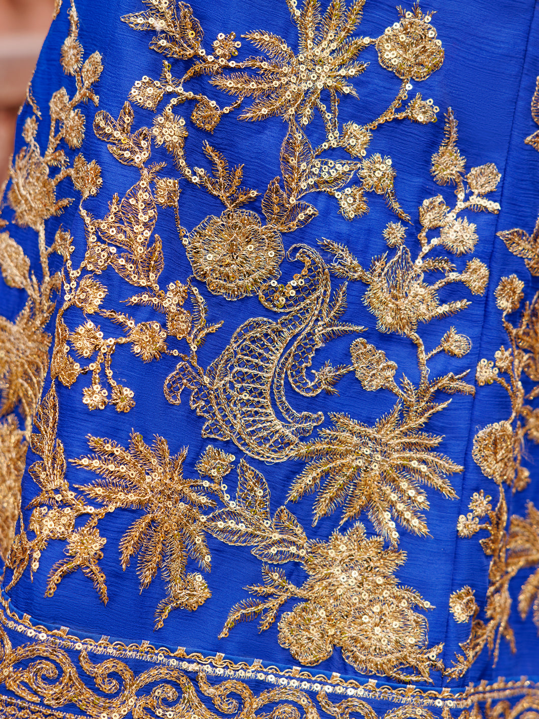 Get ready to dazzle in this beautiful royal blue chiffon frock, Step into the spotlight in this show-stopping royal blue chiffon frock, showcasing intricate gold embroidery that shimmers like gold and makes you feel like a queen.