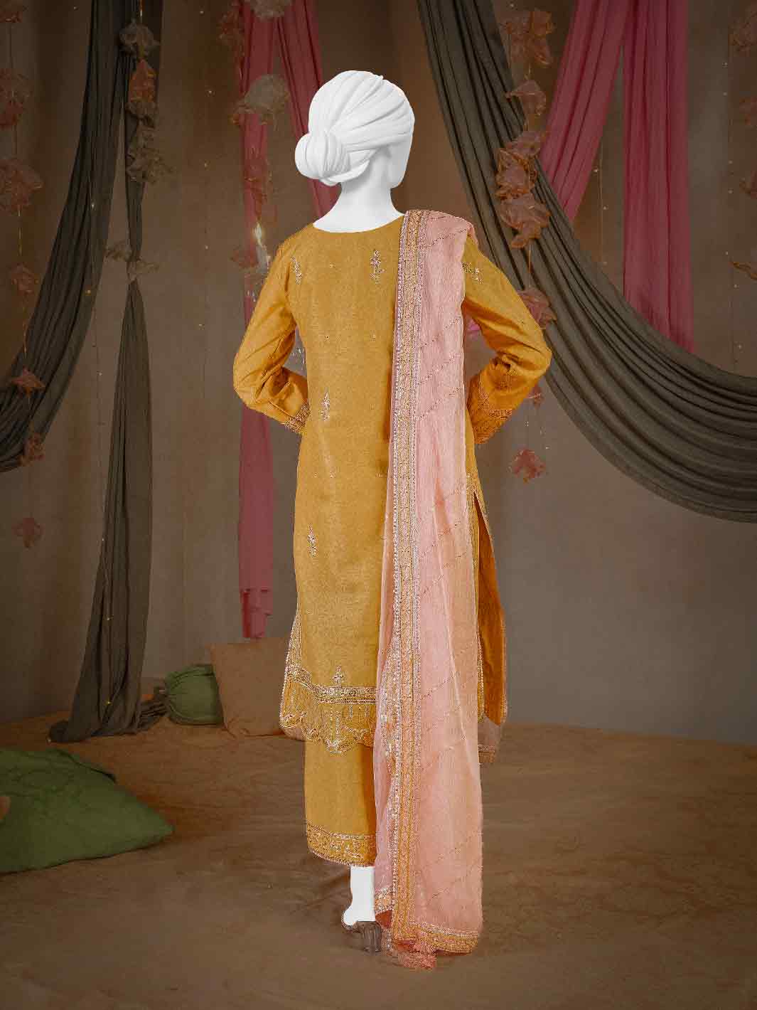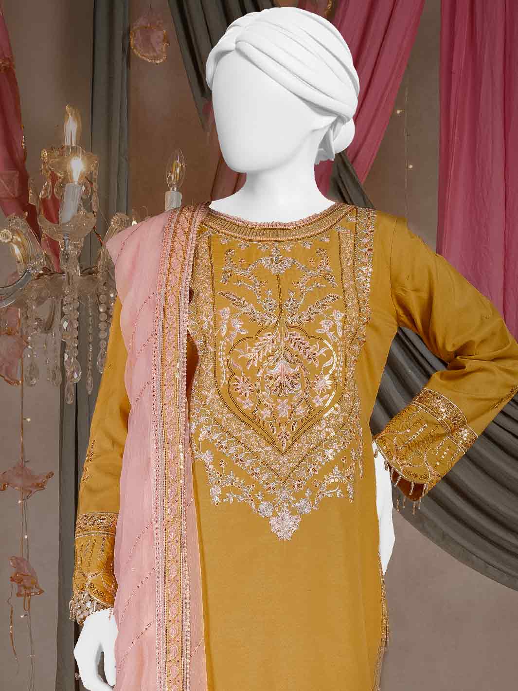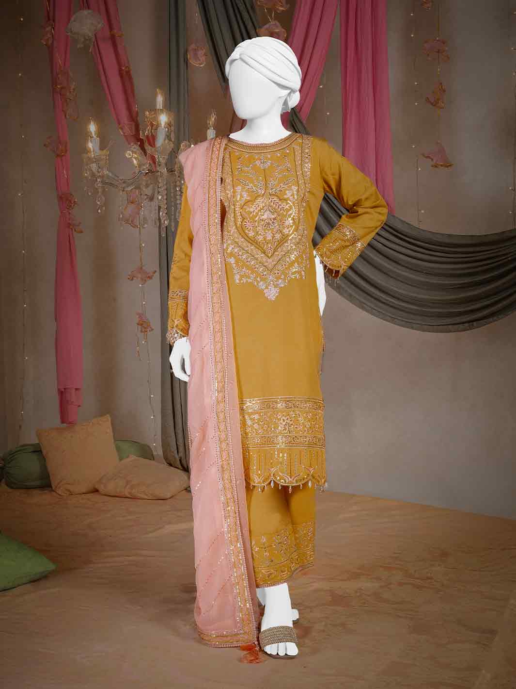 Our mid-length heavily embroidered kurta showcases floral and geometric bunches, intricately woven for a timeless, artistic appeal. It is paired with an embroidered culotte pants, adding a graceful touch to the overall look. A contrasting embroidered dupatta beautifully uplifts the ensemble, enhancing its charm and creating a stunning, balanced appearance.