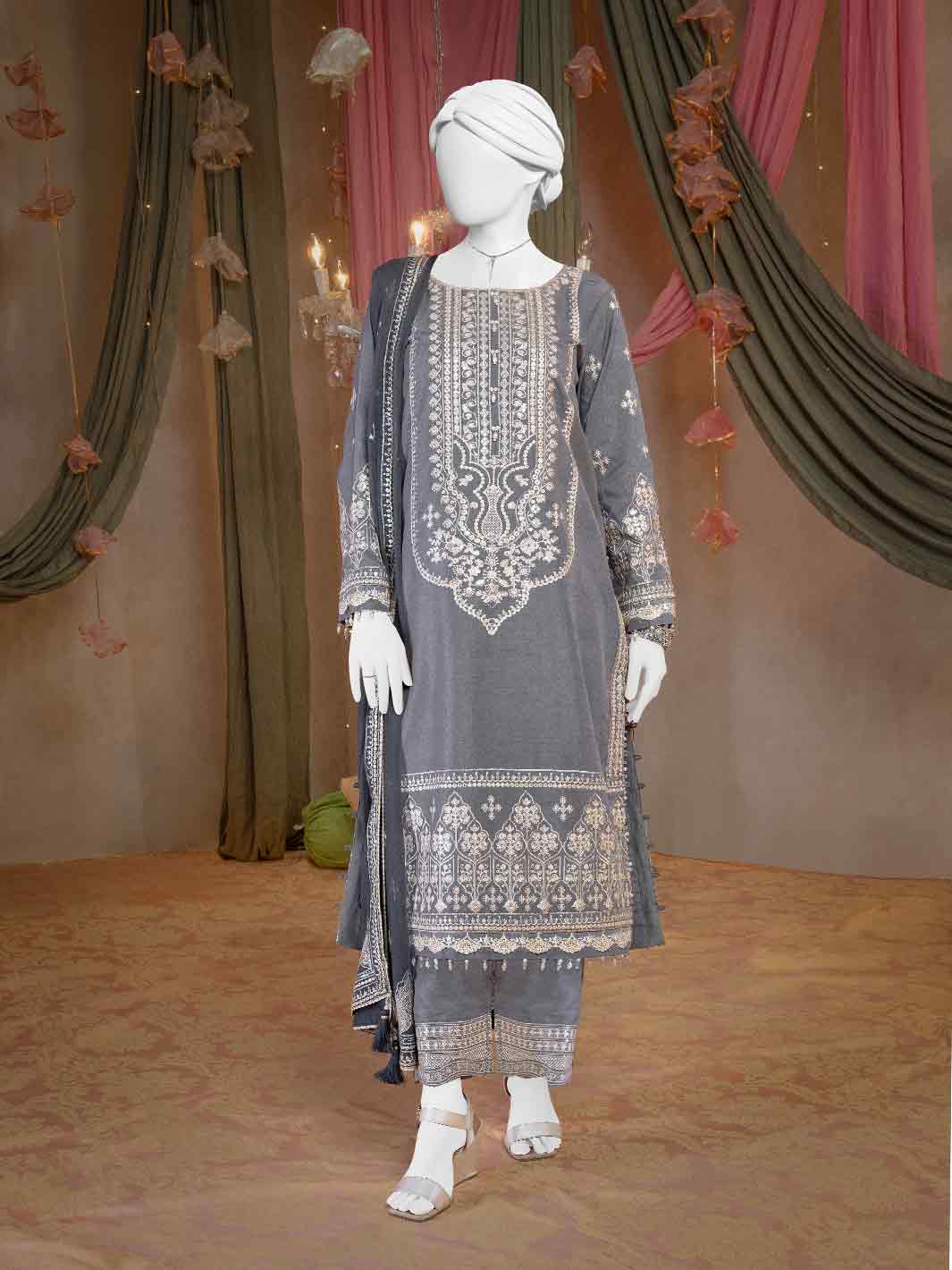 Our loose-fit kurta, adorned with delicate composed embroidery in zari and thread complementing hues, creates a stunning visual pop. Details of loops on the outfit brings the entire design to life. The kurta is paired with embroidered straight culottes and embroidered dupatta with four side lace on edges.