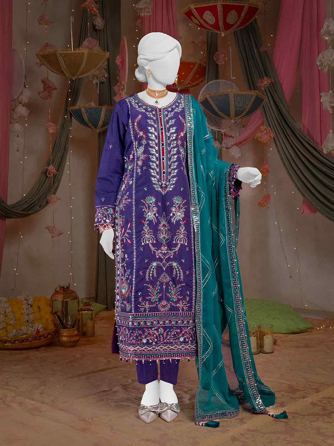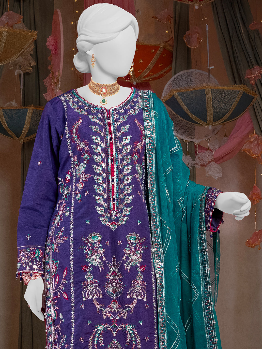 Our loose-fit kurta, adorned with delicate composed embroidery in zari and thread complementing hues, creates a stunning visual pop. The kurta is paired with straight pants and contrasting embroidered dupatta with four side lace on edges.