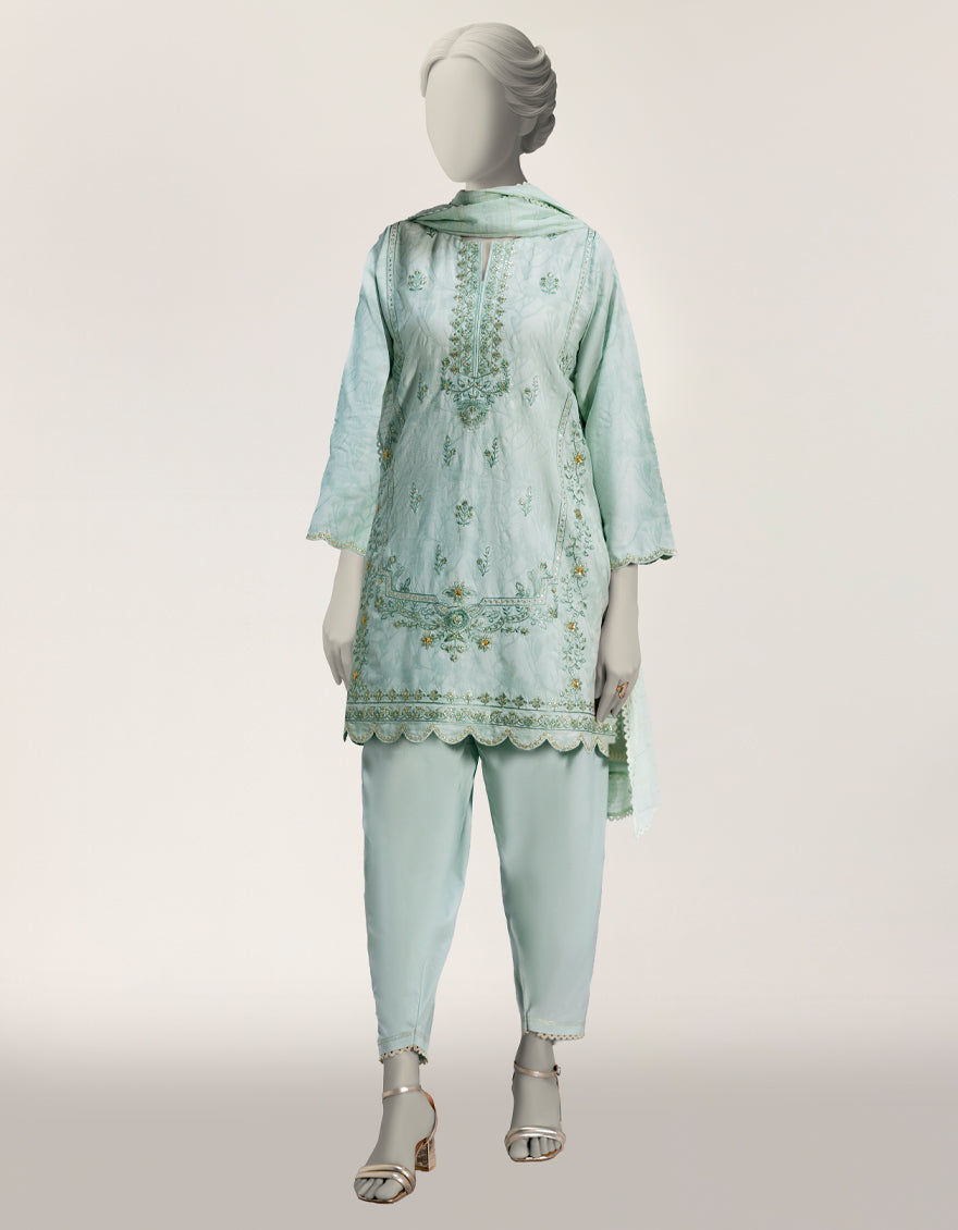 A cute three-piece casual ensemble featuring a small-length straight embroidered shirt with a round neck and V-slit. Paired with dyed shalwar and a matching Zari Tar dobby dupatta with delicate lace detailing. Perfect for casual outings or breezy festive vibes with effortless charm.
