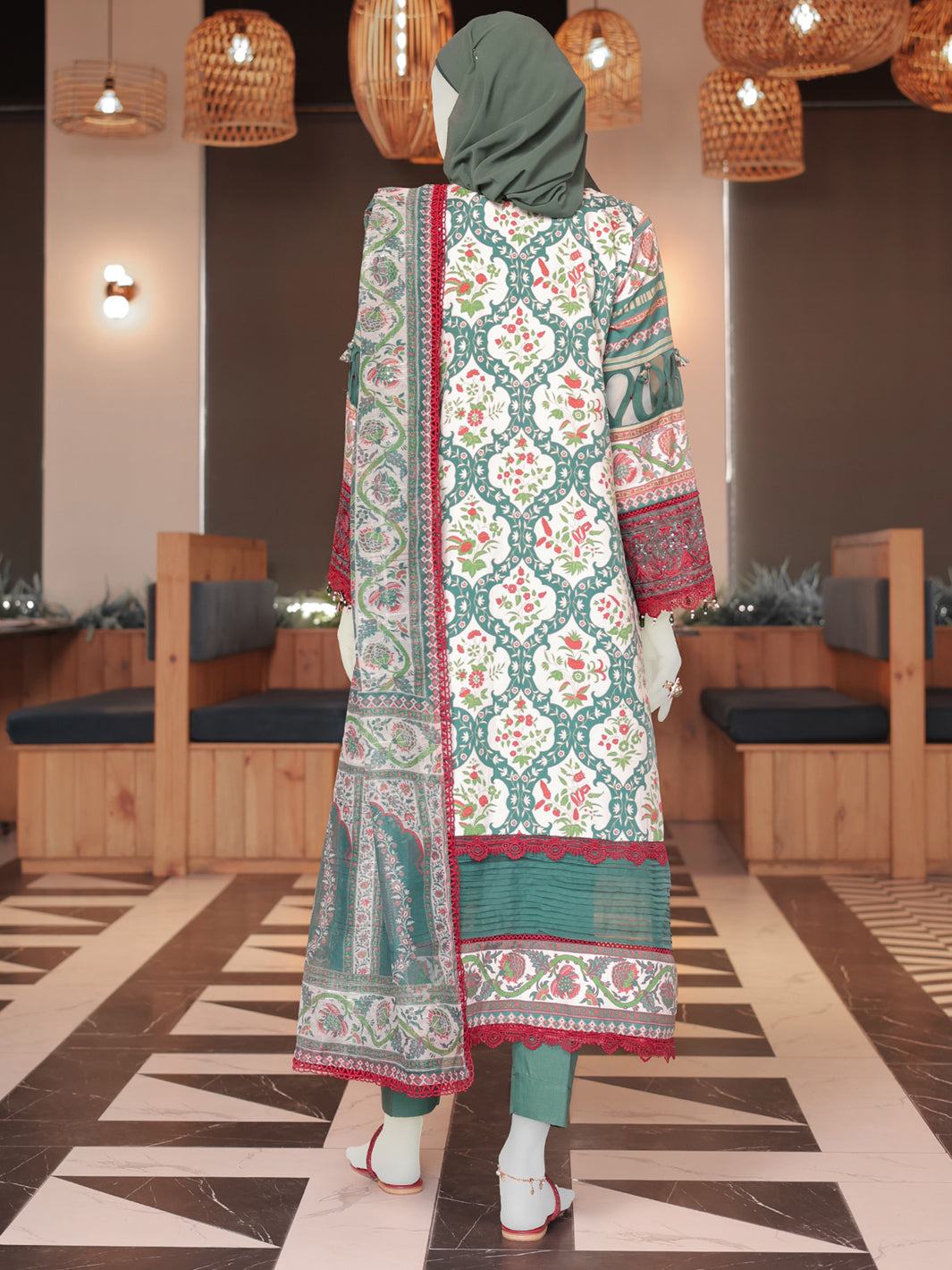 Unveil the captivating spirit of tradition in this breathtaking ensemble. Crafted with a bold canvas, intricate patterns inspired by our heritage dance across the surface, creating a mesmerizing contrast. The dupatta is an essential part of the ensemble, completing a look that commands attention and celebrates the beauty of our cultural legacy.