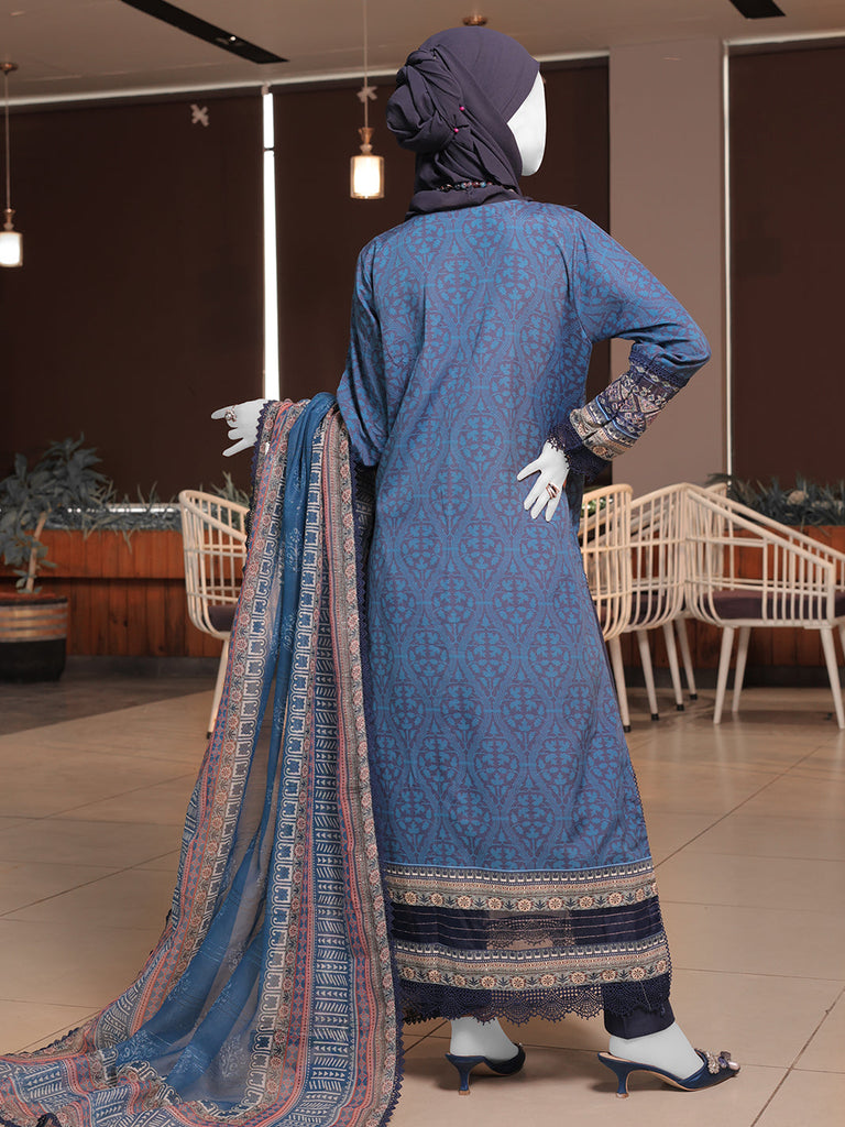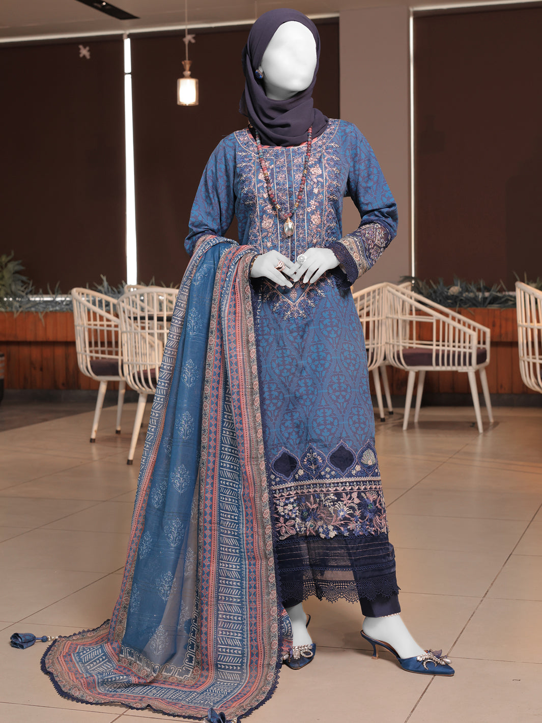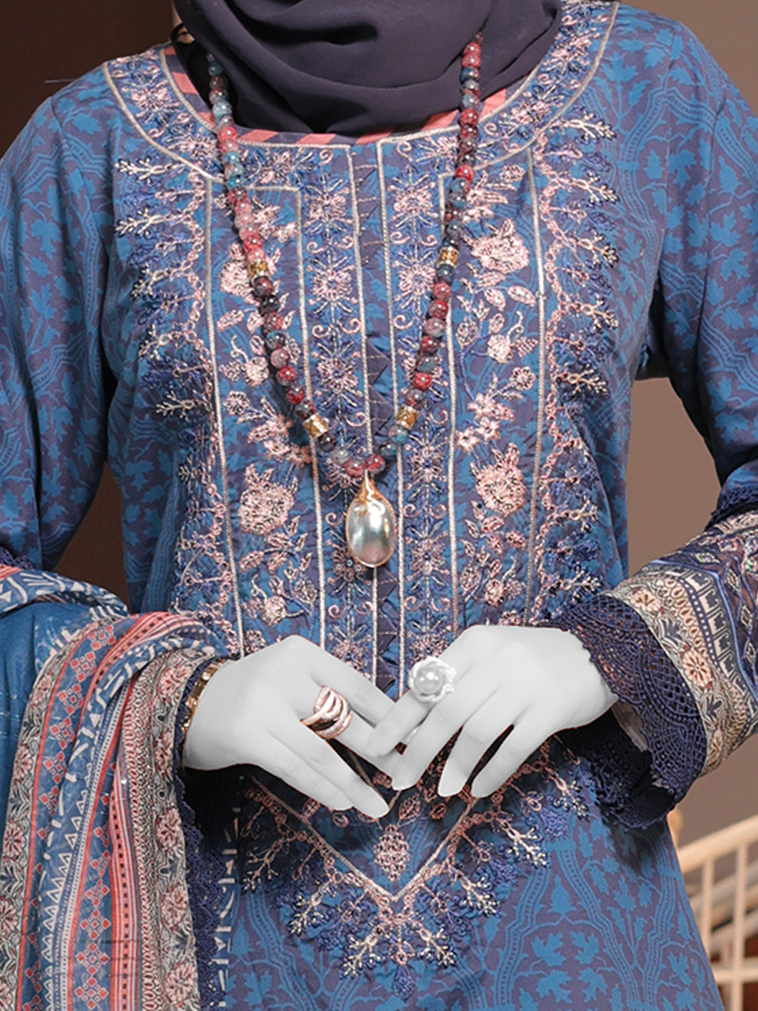 Digital printed 3-piece outfit allows for vibrant and detailed patterns with detailed embroidery on the front, adding a touch of luxury and traditional craftsmanship. The embroidery is likely done in contrasting colors to stand out against the blue background, adding texture and depth to the overall design.
