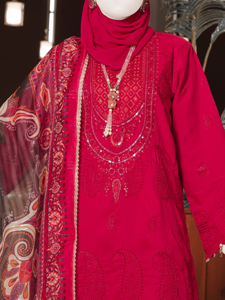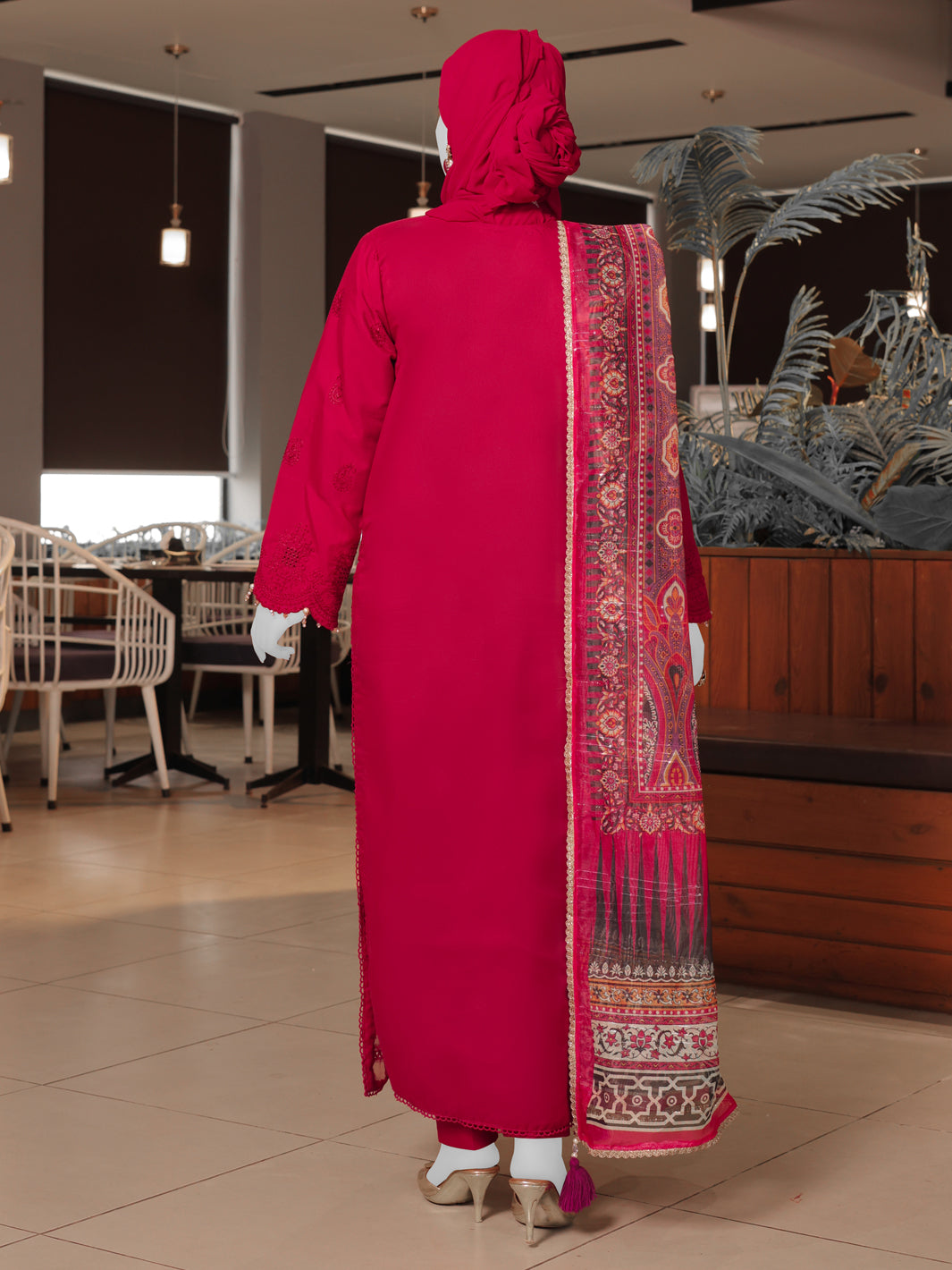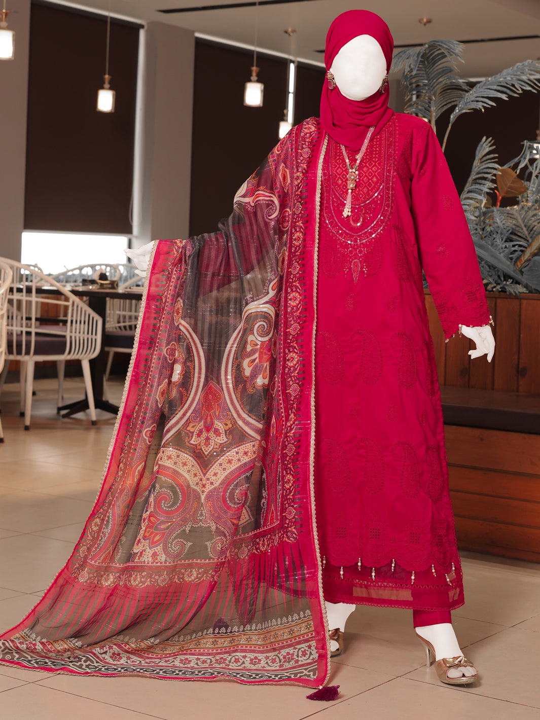 This radiant red type of outfit is suitable for casual and semi-formal occasions, especially in the warmer months. The use of embroidery and digital print makes it a fashionable choice for daytime events or gatherings.