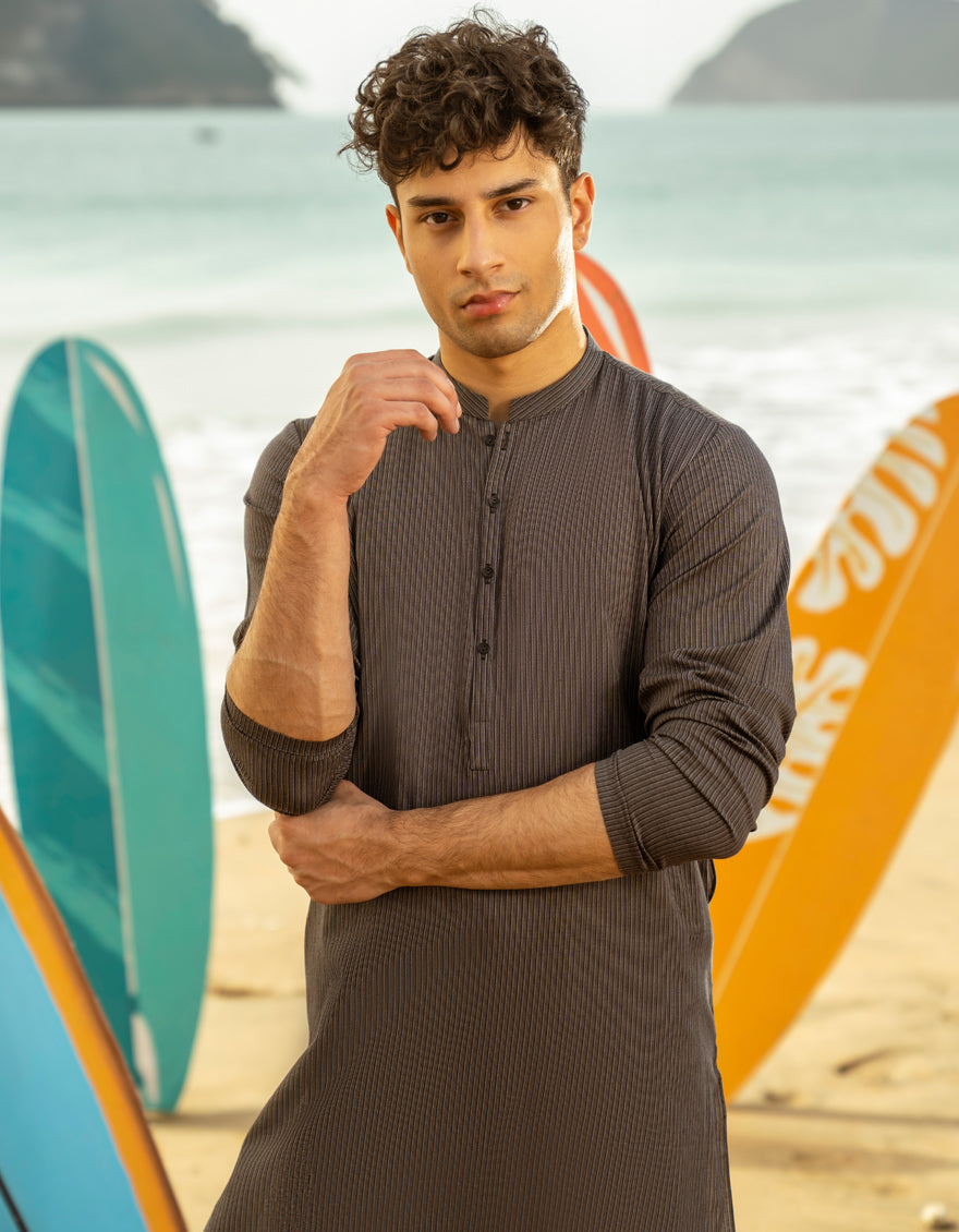 Explore our latest teen boys' Grey Cotton Kurta, designed with a blend of classic simplicity and Eastern charm. These kurtas offer a stylish yet understated look, suitable for a variety of occasions.