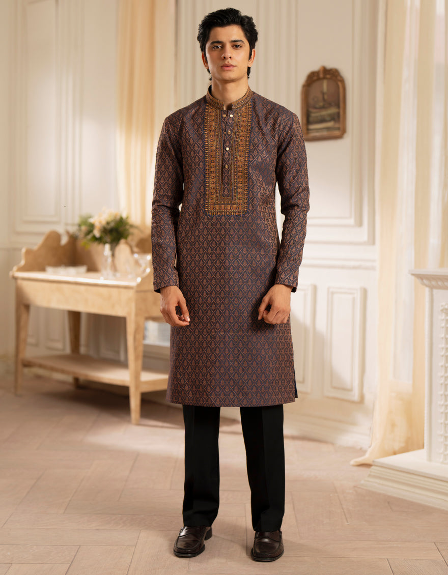 Crafted with precision and style, a formal kurta for men exudes grace with its classic lines, opulent fabrics, and tasteful embellishments, making it a symbol of sartorial elegance for ceremonial events and celebrations.