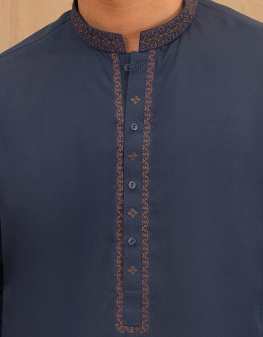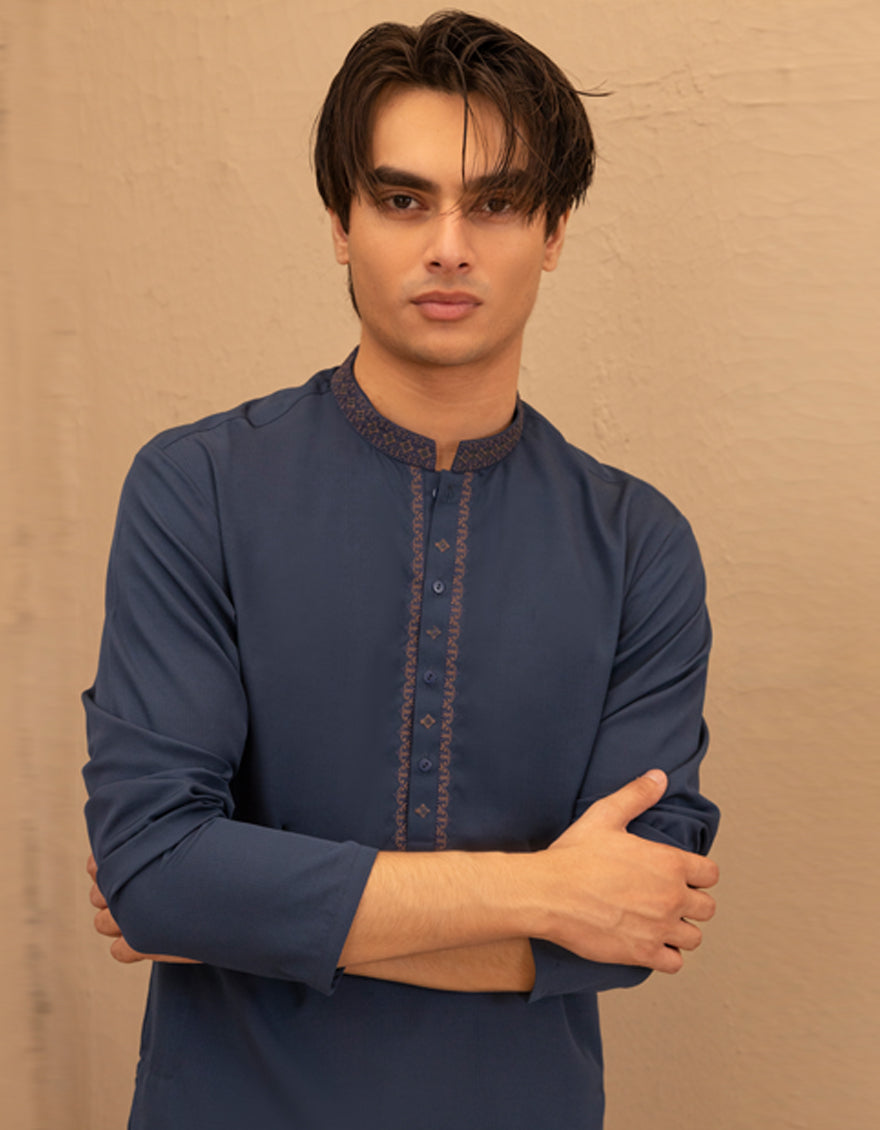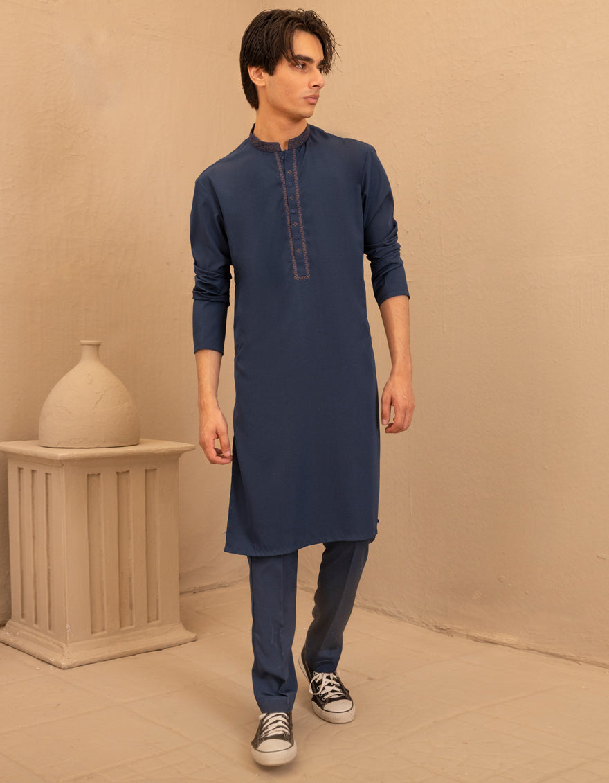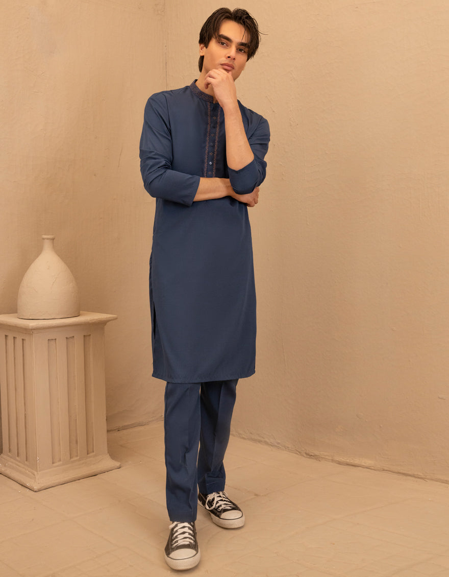 Designed with a refined touch, this blue blended semi-formal kurta trouser set offers a clean look that's ideal for small events, meetups, or evening wear.