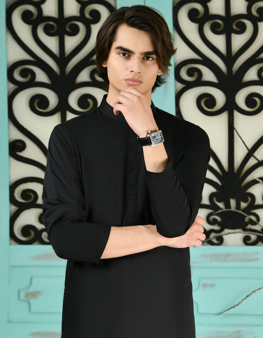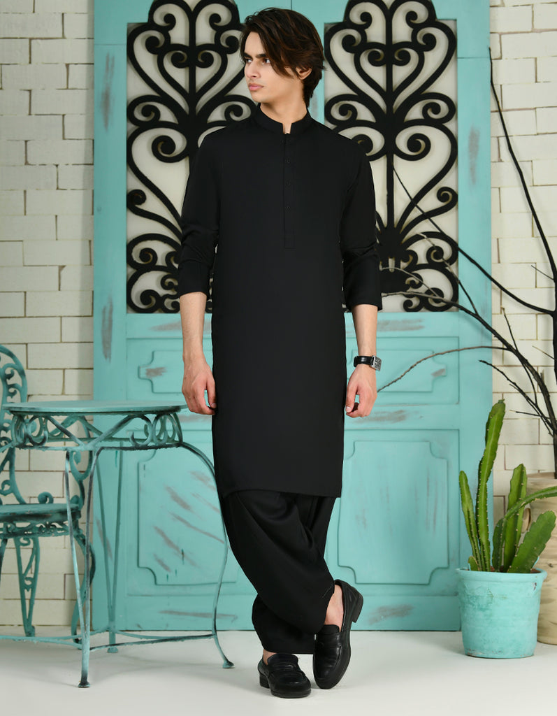 Explore our latest teen boys' black blended casual kameez shalwar, designed with a blend of classic simplicity and Eastern charm. This oufit offer a stylish yet understated look, suitable for a variety of occasions.