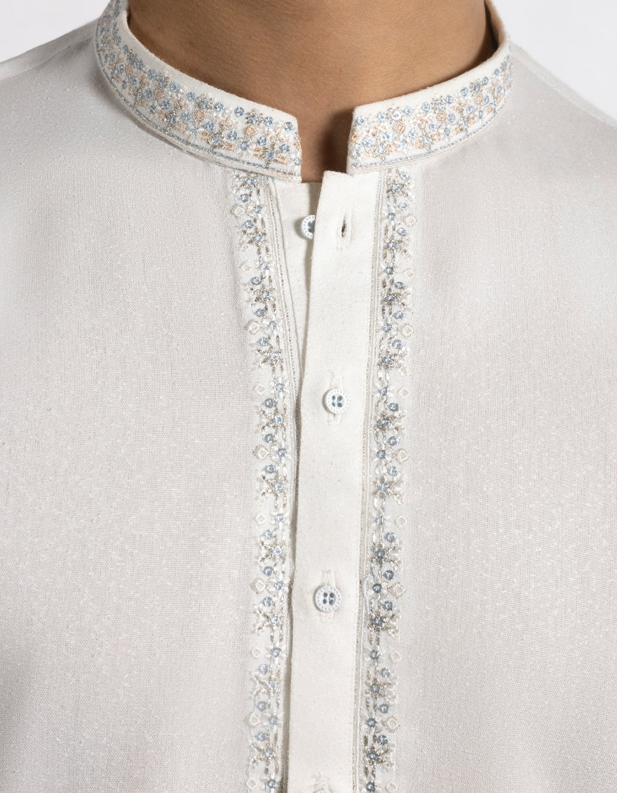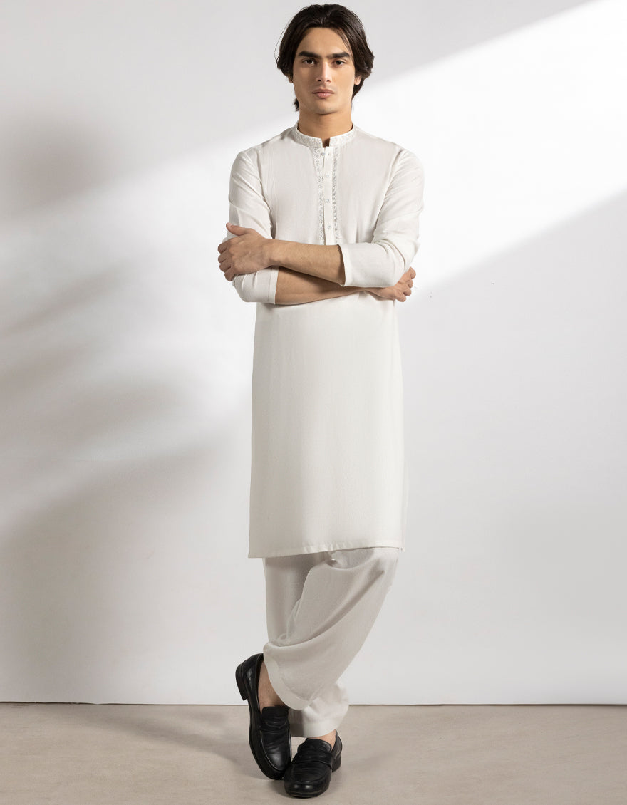 This Off White Blended Kameez Shalwarstands out with its fine stitching and a unique touch of design. Subtle patterns and smart button detailing add to its appeal. A graceful pick that blends decency with a stylish look.